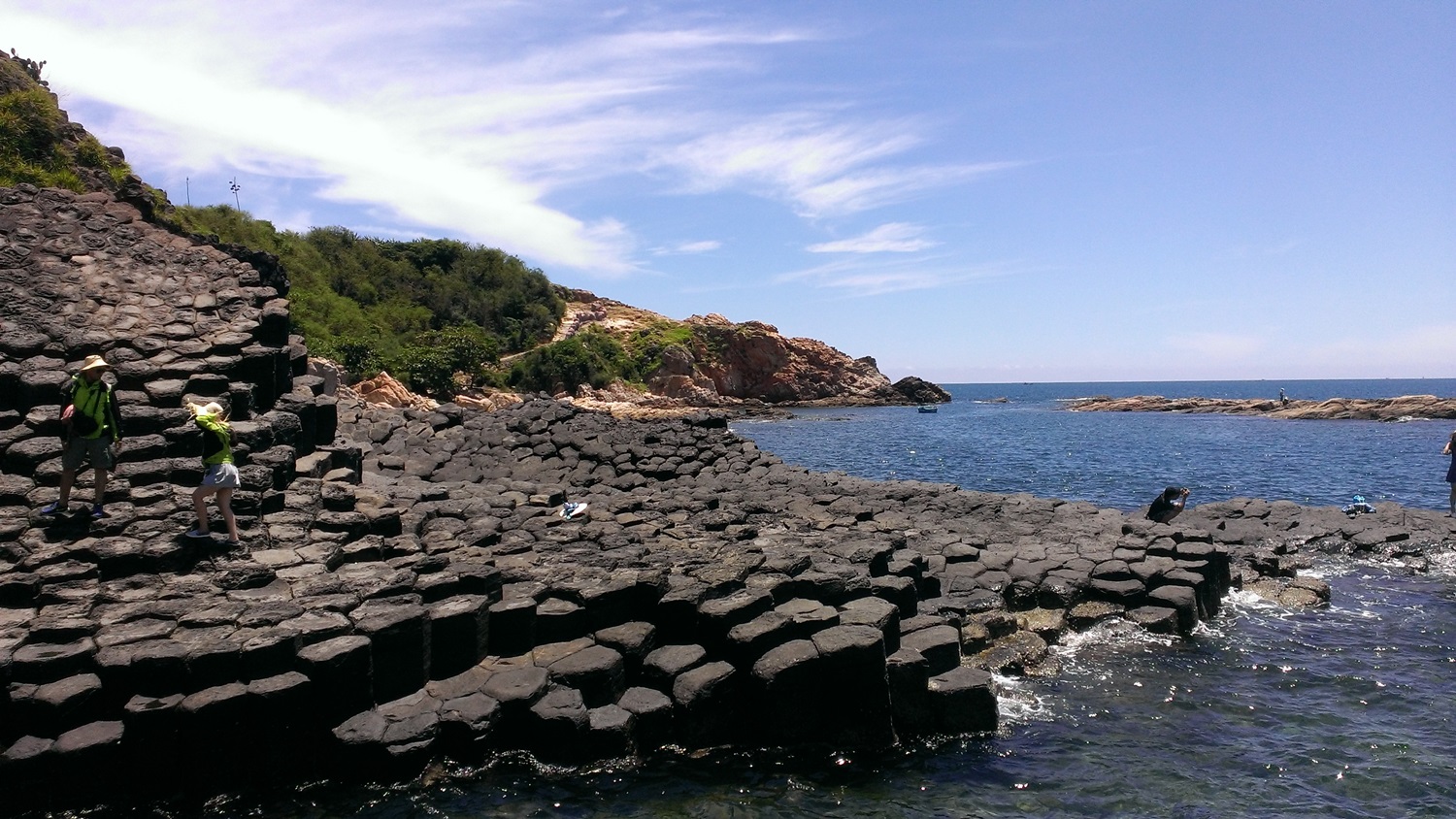 Sau khi thưởng thức đặc sản “đèn pha đại dương” (mắt cá Ngừ) – món độc quyền của tỉnh Phú Yên, chúng tôi tiếp tục hành trình ghé thăm ghềnh đá Đĩa. Tạo hóa đã dày công xếp đặt những phiến đá hình lục giác chồng lên nhau thành từng khối dĩa lớn giữa mây trời bồng bềnh, nước biển trong xanh như một kỳ quan hiếm thấy, xua đi cảm giác bất an lúc vượt qua đèo Cả.