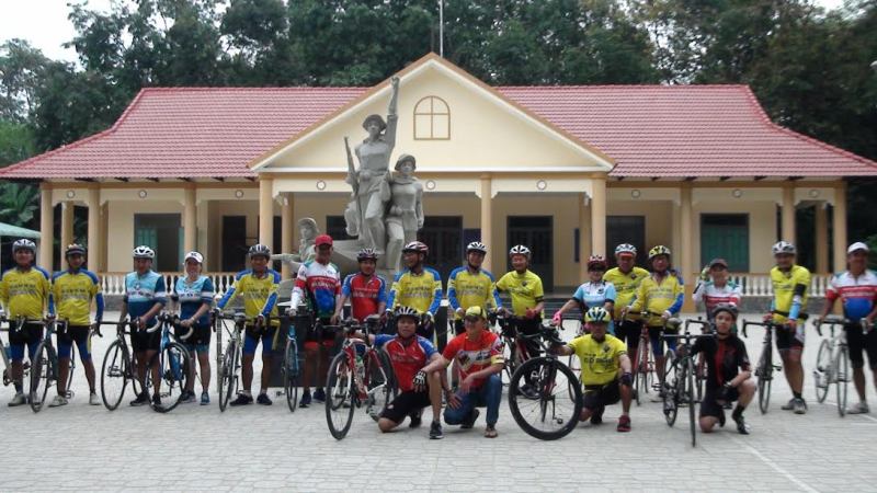 Thành viên CLB xe đạp xã Lợi Thuận tại Khu di tích lịch sử văn hóa Địa đạo Lợi Thuận. |