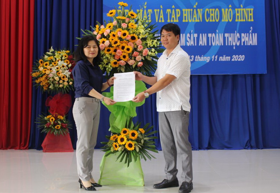 Ông Đỗ Hoàng Hải Đăng-Phó Chủ tịch UBND phường Hiệp Tân trao quyết định ra mắt mô hình “Tổ vận động phụ nữ giám sát an toàn thực phẩm” cho Hội LHPN phường.
