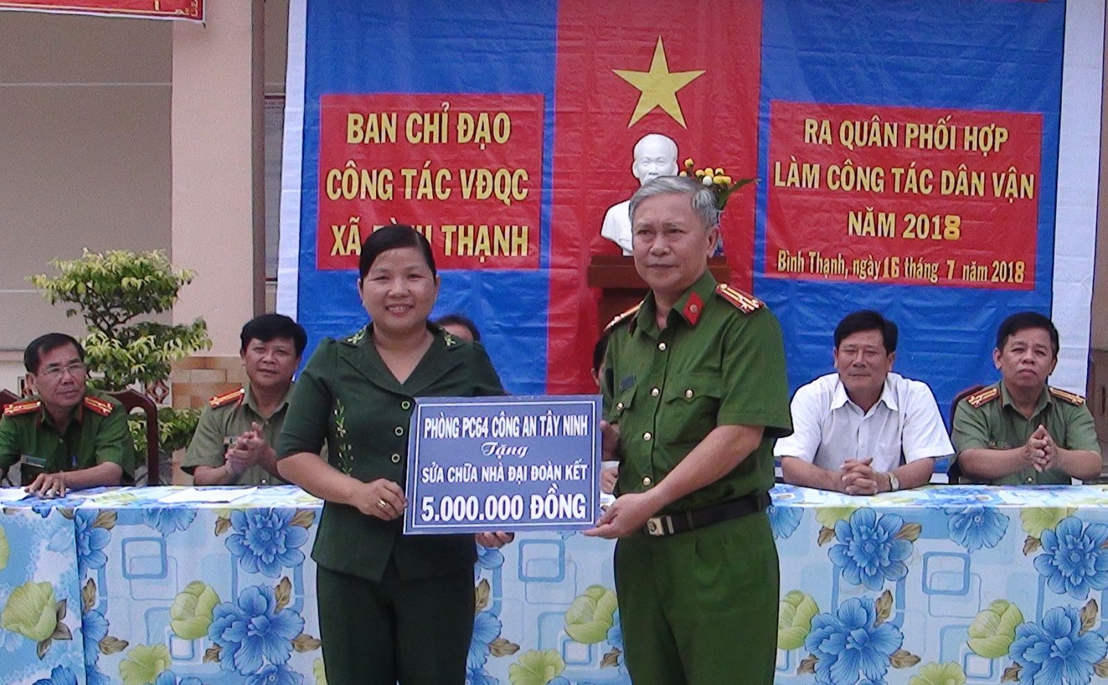 Cũng tại buổi lễ, đại diện Công an Tây Ninh trao số tiền 5 triệu đồng cho Ban Chỉ đạo xã Bình Thạnh để sửa chữa nhà đại đoàn kết cho hộ nghèo của xã trong đợt dân vận lần này.