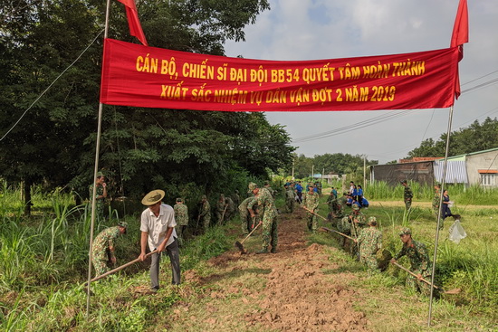 Ngay sau lễ ra quân, hơn 60 cán bộ, chiến sĩ thuộc Đại đội BB54 đã phối hợp cùng lực lượng Dân quân thường trực, Công an xã, đoàn viên, thanh niên và nhân dân ấp Lộc Chánh, xã Lộc Hưng tổ chức nâng cấp, dặm vá, phát quang 1.500m đường giao thông nông thôn trong ấp.
