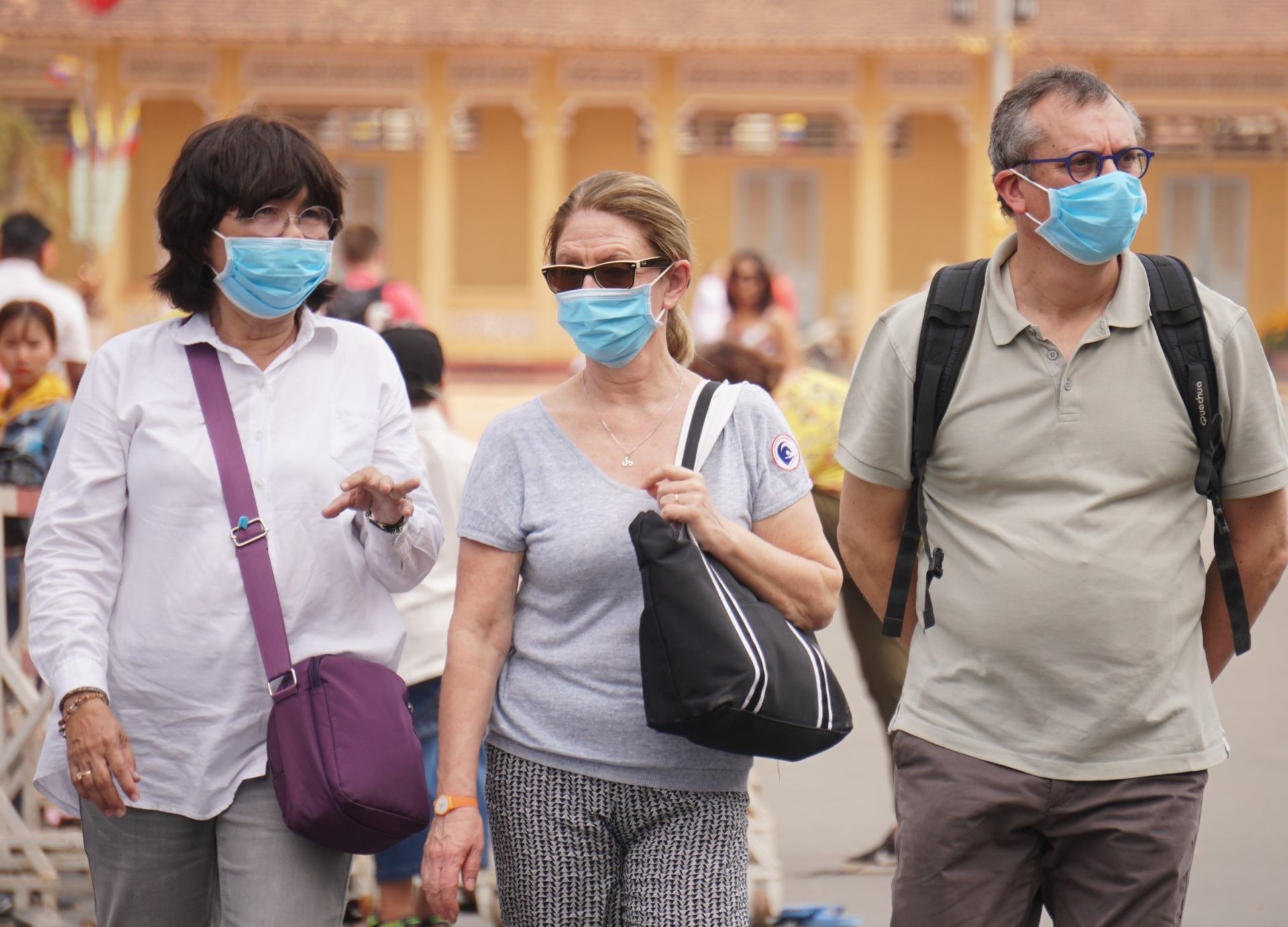 Khách du lịch đến tham quan Toà thánh Cao Đài Tây Ninh đều mang khẩu trang để phòng, chống lây lan dịch bệnh Covid-19.