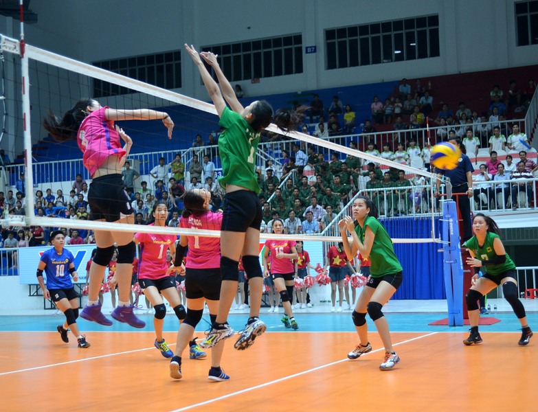 Pha lên lưới thành công của Thanh Thuý (8 - Vietinbank) trong trận đấu giữa Vietinbank với VTV Bình Ðiền LA. Ảnh: Tuấn Anh