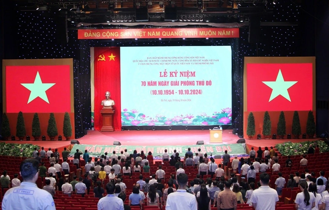 Sáng 10/10, tại Trung tâm Hội nghị quốc gia (số 1 Đại lộ Thăng Long, quận Nam Từ Liêm) Ban Chấp hành Trung ương Đảng Cộng sản Việt Nam - Quốc hội - Chủ tịch nước - Chính phủ nước Cộng hòa xã hội chủ nghĩa Việt Nam - Ủy ban Trung ương Mặt trận Tổ quốc Việt Nam và thành phố Hà Nội tổ chức trọng thể Lễ kỷ niệm cấp quốc gia 70 năm Ngày Giải phóng Thủ đô (10/10/1954 - 10/10/2024).