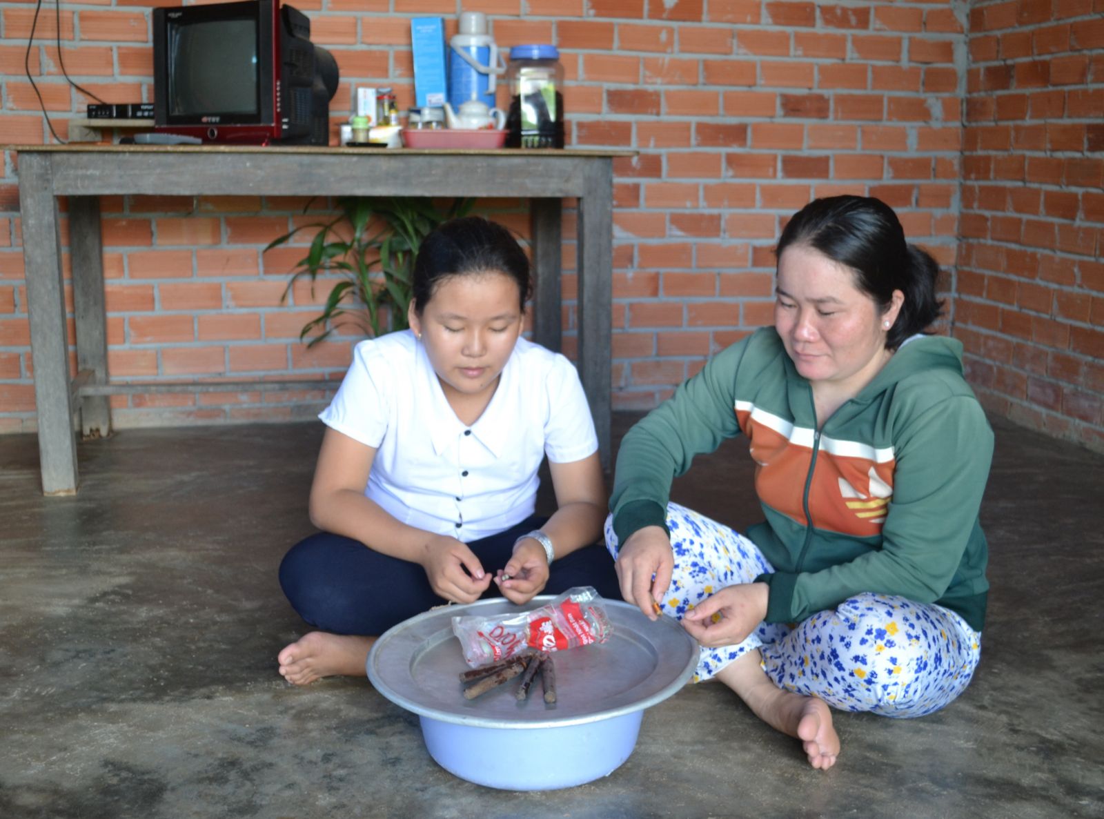 Mẹ em ở nhà lo việc nội trợ và nhận hạt điều về tách lụa thuê để kiếm thêm thu nhập. Làm công việc này, bình quân mỗi ngày mẹ em chỉ kiếm được 100 ngàn đồng.
