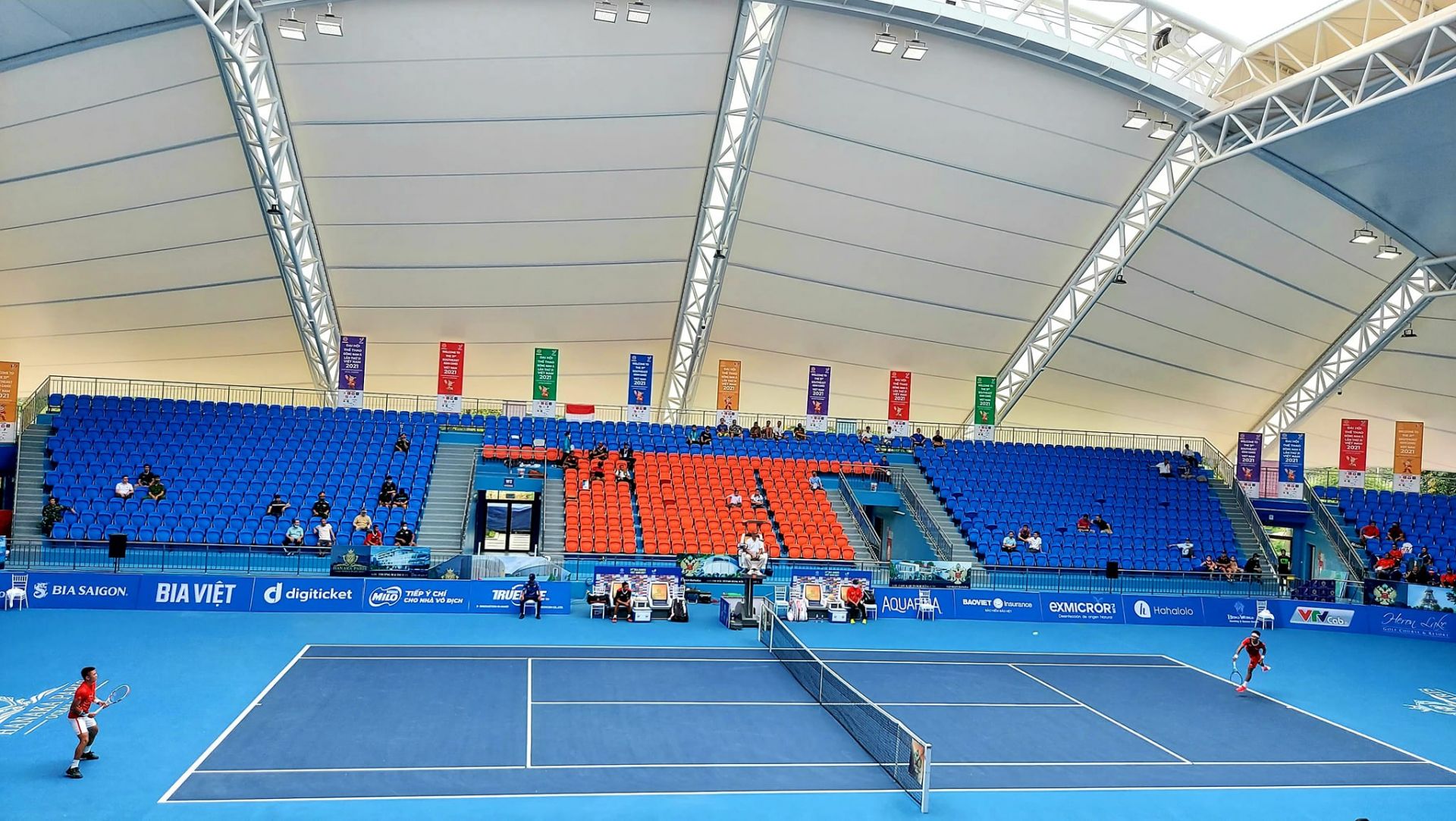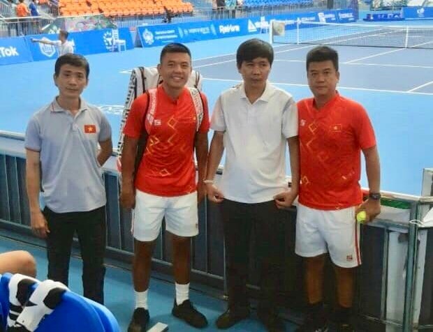 VĐV Lý Hoàng Nam (bên trái) thi đấu môn quần vợt, nội dung đồng đội nam.