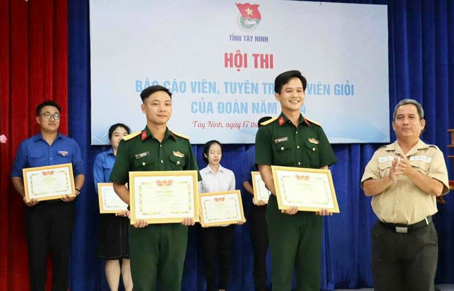 Thượng úy Phạm Văn Hòa (bên trái) đạt giải Nhì Hội thi Báo cáo viên, tuyên truyền viên trẻ năm 2024 do Tỉnh Đoàn Tây Ninh tổ chức.