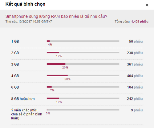 Khảo sát của Số Hóa từ 11/3 đến 13/3 cho câu hỏi "Smartphone cần RAM bao nhiêu thì đủ?" đã có hơn 1.400 độc giả tham gia bình chọn. Hầu hết ý kiến cho rằng, đối với nhu cầu hiện nay, một smartphone RAM 4 GB là đã đủ nhu cầu.