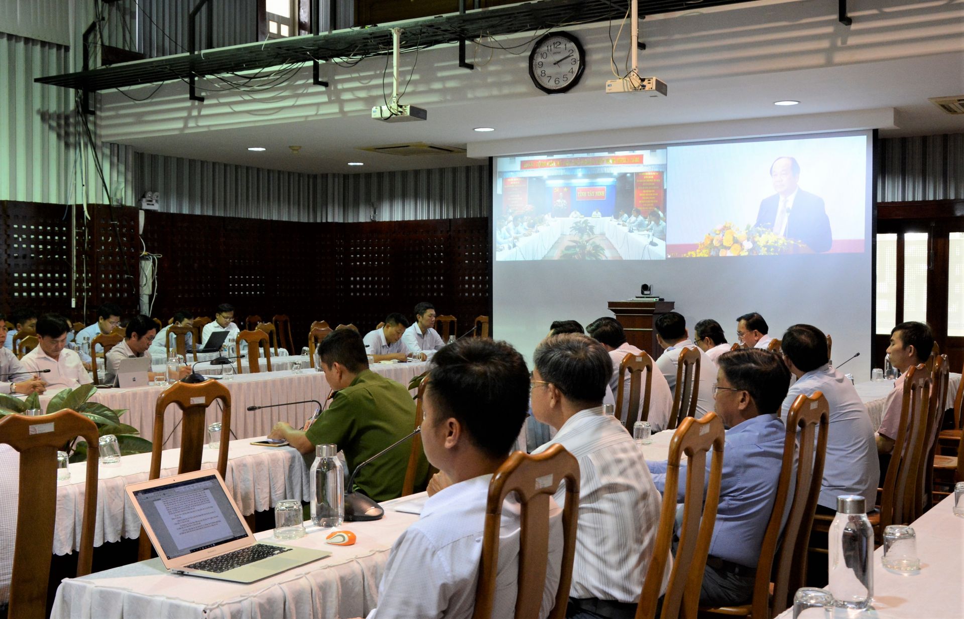 Phó Chủ tịch UBND tỉnh Trần Văn Chiến và lãnh đạo các sở, ban, ngành tỉnh dự hội nghị tại điểm cầu tỉnh.