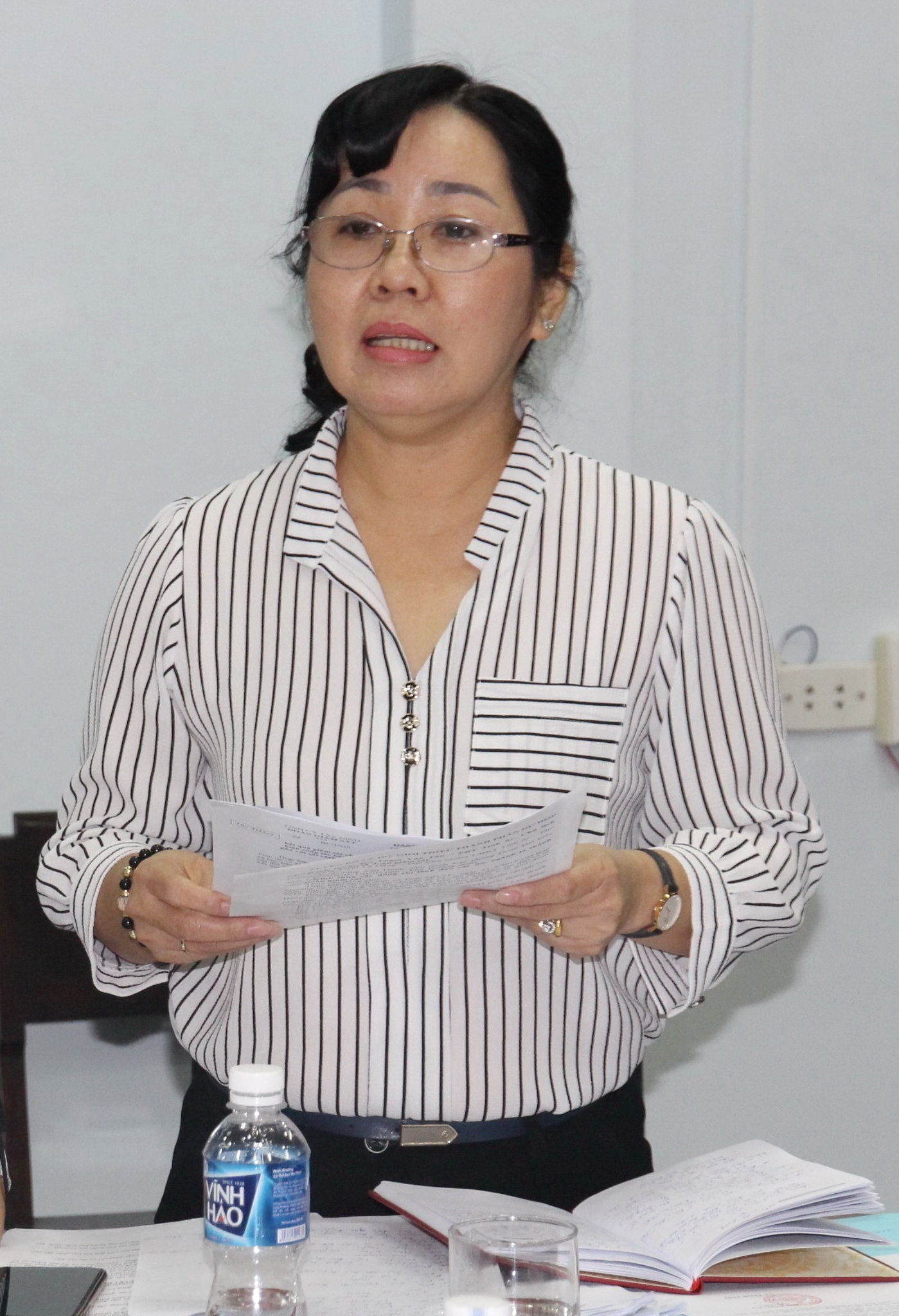 Bà Võ Thanh Thuỷ báo cáo kết quả thực hiện công tác BHXH, BHYT, BHTN của tỉnh từ năm 2012-2018.