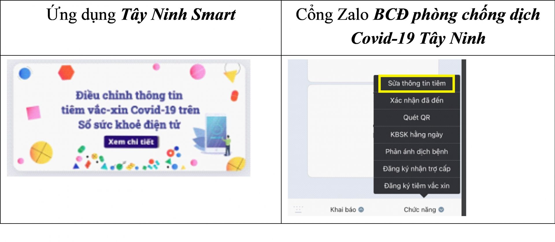 Để đề nghị điều chỉnh thông tin đã tiêm, vào ứng dụng “Tây Ninh Smart” hoặc Cổng Zalo “BCĐ phòng chống dịch Covid-19 Tây Ninh” (chọn quan tâm) và chọn như sau: