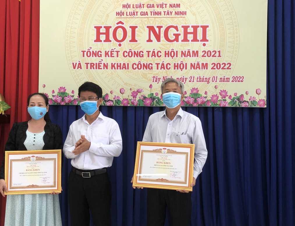 Ông Phạm Văn Đặng- Giám đốc Sở Tư pháp tặng bằng khen của Hội Luật gia Việt Nam cho các tập thể hoàn thành xuất sắc nhiệm vụ năm 2021. Ảnh: Tâm Giang