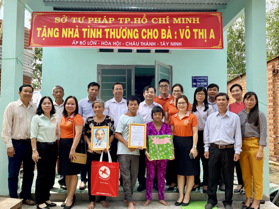 Sáng 10.7, Sở Tư pháp TP.HCM phối hợp cùng Sở Tư pháp và UBND huyện Châu Thành tổ chức bàn giao căn nhà đại đoàn kết cho gia đình bà Võ Thị A, sinh năm 1964, ngụ ấp Bố Lớn, xã Hòa Hội.