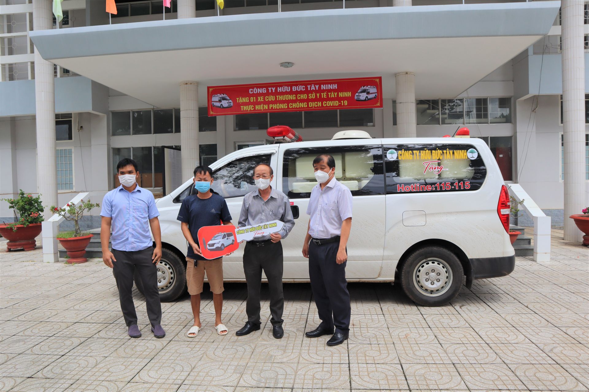 Tại buổi lễ, bác sĩ Nguyễn Văn Cường - Phó Giám đốc phụ trách Sở Y tế tiếp nhận chiếc xe cứu thương chuyên dụng trị giá 600 triệu đồng, do Công ty TNHH Hữu Đức trao tặng để phục vụ công tác phòng chống dịch Covid-19.