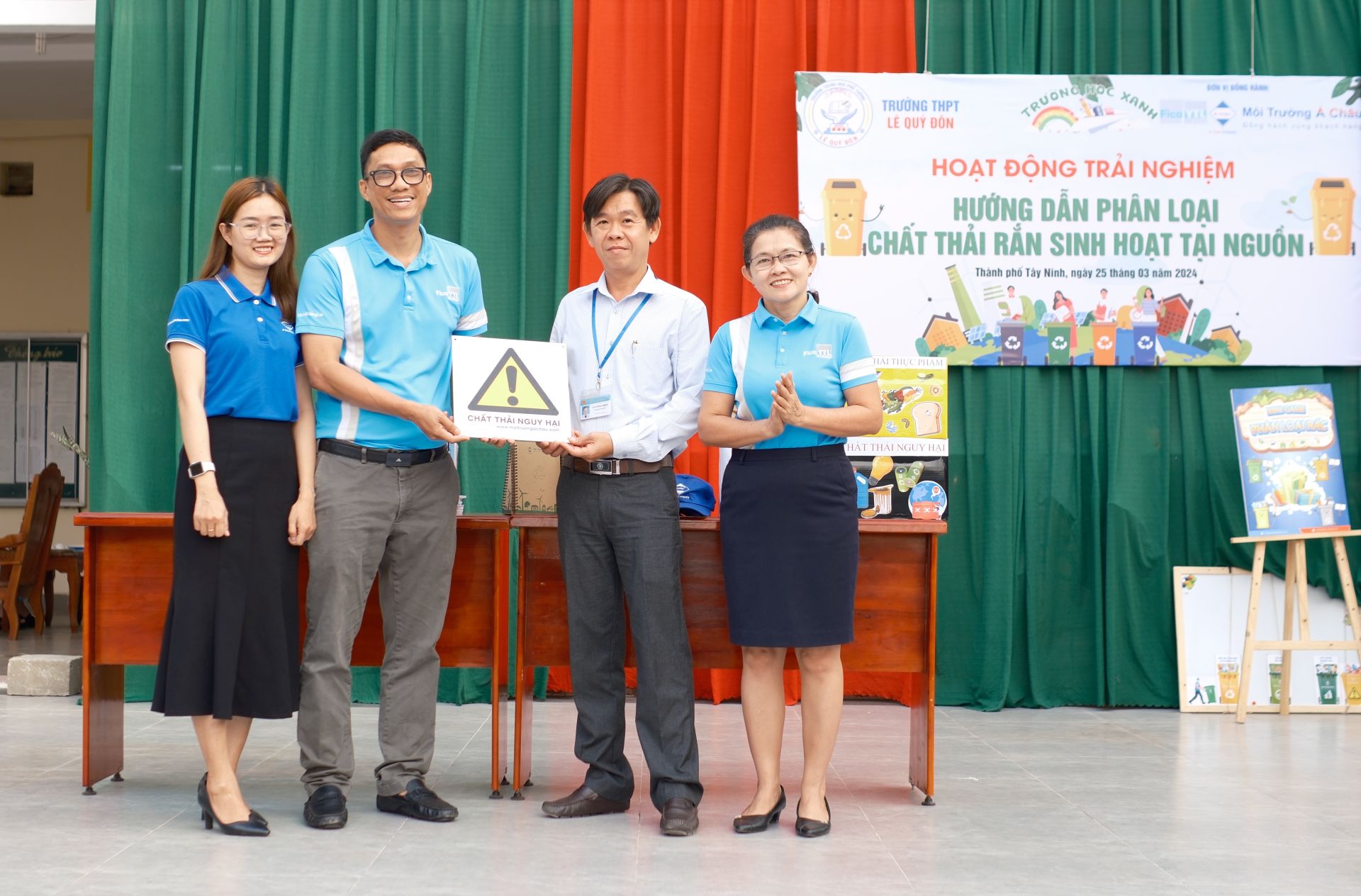 Đại diện Công ty xi măng Fico-YTL Tây Ninh và Công ty môi trường Á Châu trao tặng biển báo chất thải nguy hại cho Ban Giám hiệu trường THPT Lê Quý Đôn.