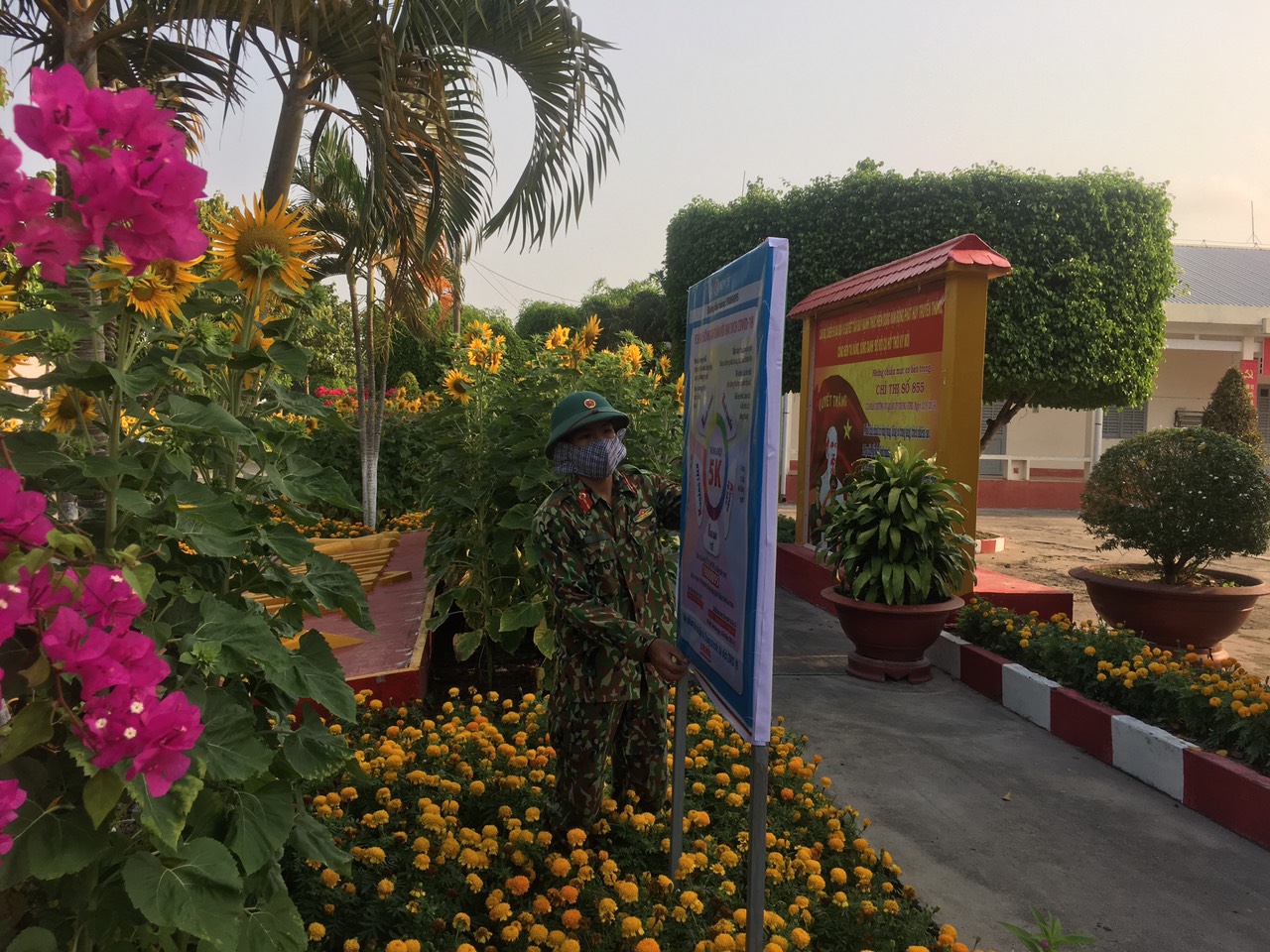 Lắp đặt pano tuyên truyền khuyến cáo “5K” của Bộ Y tế phía trước đơn vị.