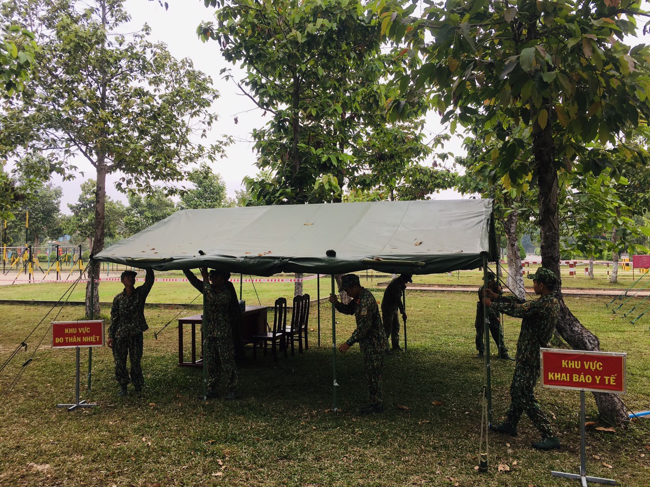 Dựng Nhà bạt khu vực đo thân nhiệt, khai báo y tế.