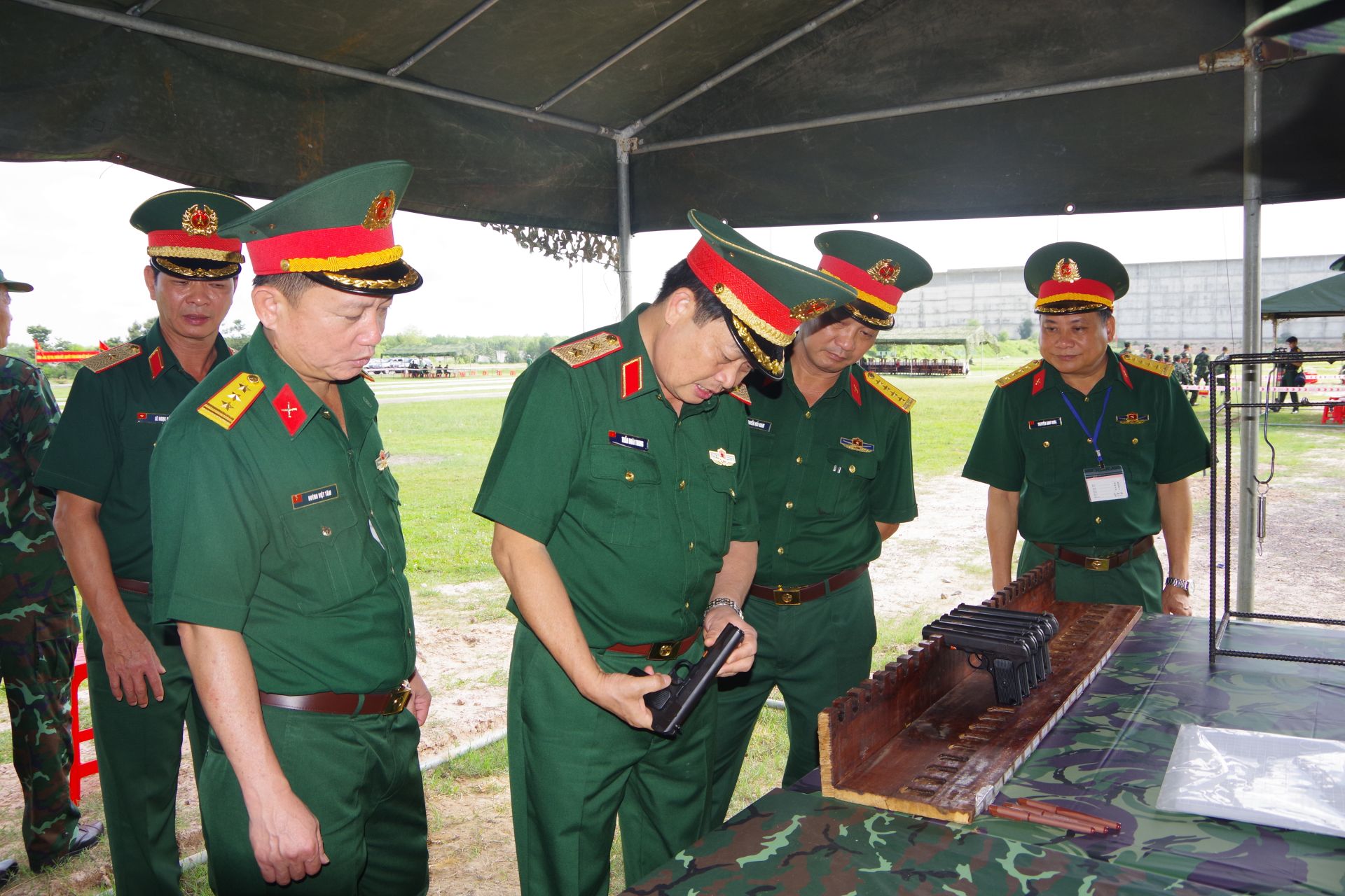 Trung tướng Trần Hoài Trung- Chính uỷ Quân khu 7 kiểm tra hệ số kỹ thuật súng ngắn K54 bảo đảm cho hội thi, hội thao.