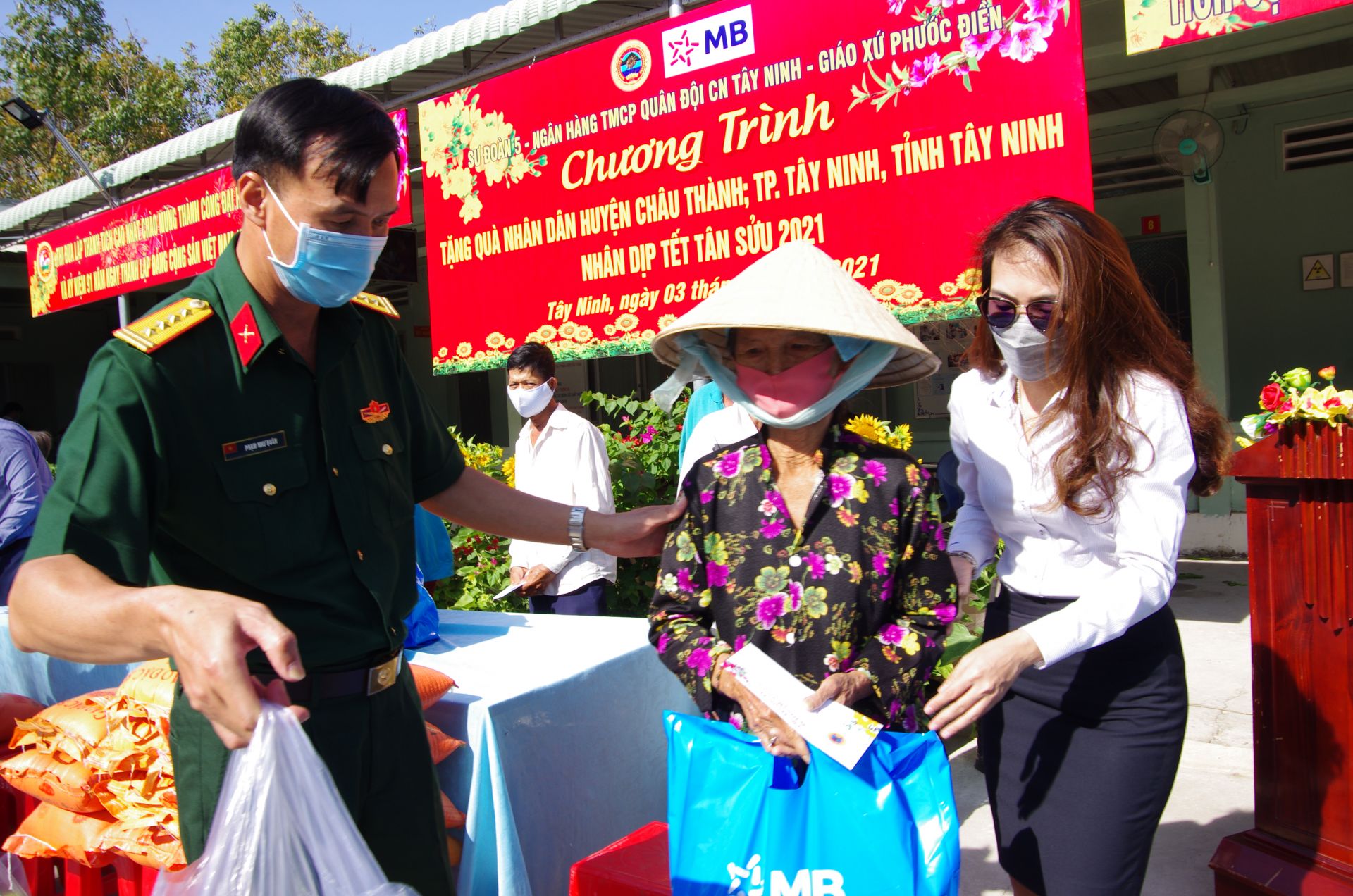 Đại tá Phạm Như Quân- Phó chính ủy Sư đoàn 5 cùng cán bộ Ngân hàng thương mại cổ phần Quân đội chi nhánh Tây Ninh tặng quà cho người dân.