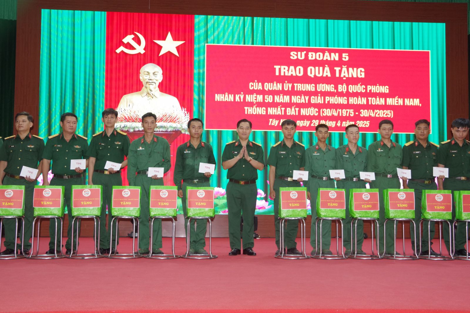 Tại buổi lễ, Thượng tá Lê Đức Nhân, Phó Chính uỷ Sư đoàn 5 đã trao tặng 40 suất quà (mỗi phần quà trị giá 1,2 triệu đồng) cho các đồng chí là sĩ quan, quân nhân chuyên nghiệp, hạ sĩ quan, chiến sĩ có hoàn cảnh đặc biệt khó khăn, mắc bệnh hiểm nghèo, ốm đau nằm viện dài ngày, gia đình bị thiệt hại nặng do thiên tai, hoả hoạn…