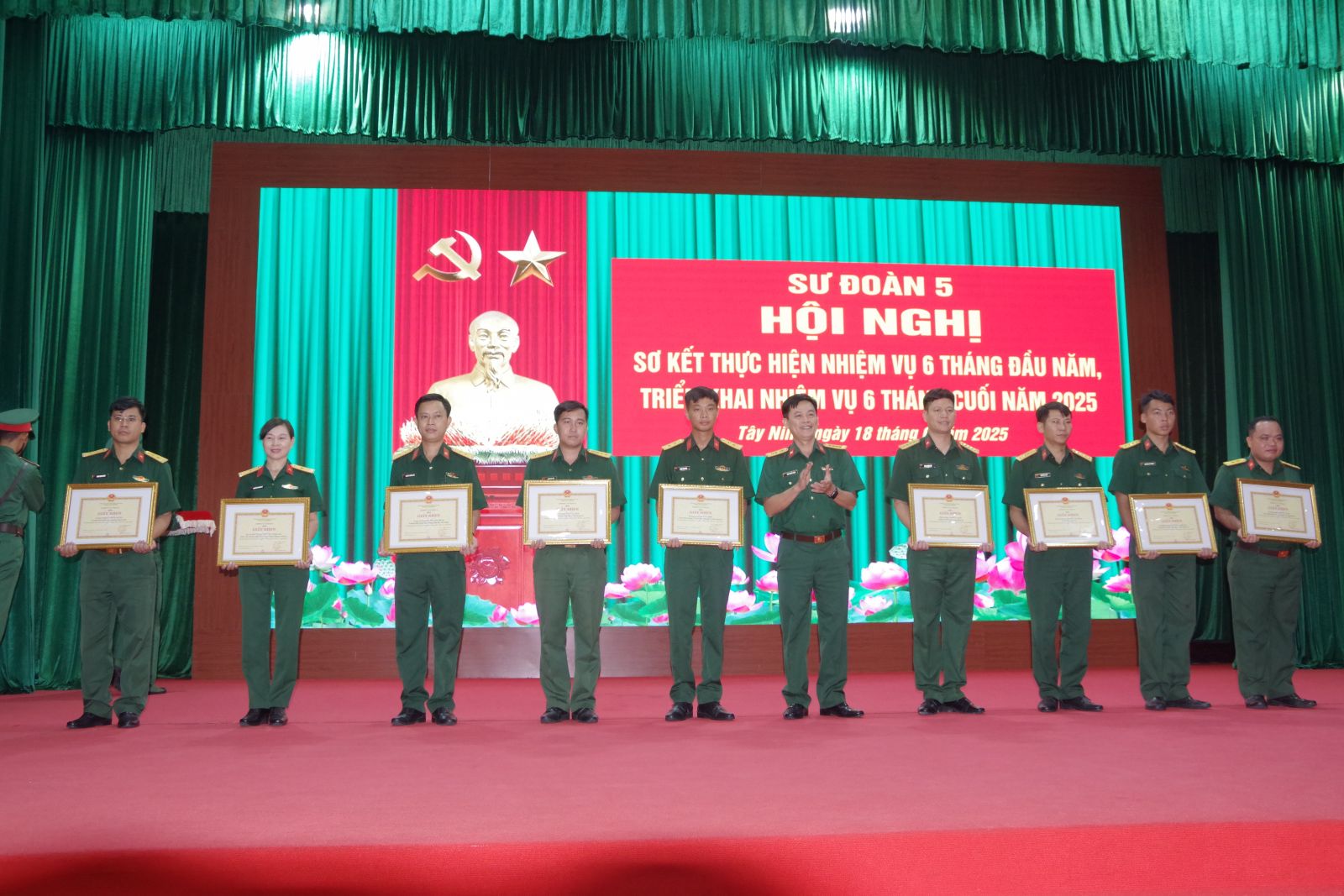 Dịp này, Sư đoàn 5 đã khen thưởng 7 tập thể và 9 cá nhân hoàn thành xuất sắc nhiệm vụ trong 6 tháng đầu năm 2025.