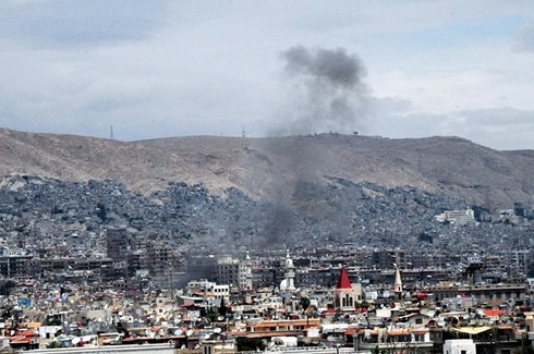 Khói bốc lên tại hiện trường một vụ tấn công bằng tên lửa ở Damascus, Syria ngày 9/5. (Nguồn: THX/TTXVN)