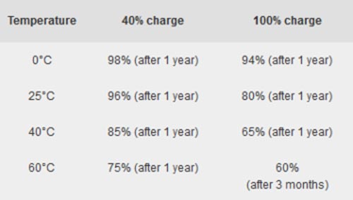 Ví dụ, nếu viên pin của bạn phải chịu mức nhiệt độ 40˚C trong 1 năm, bạn sẽ chỉ khôi phục được 65% hiệu năng pin khi bạn sạc đầy nó. Đáng ngạc nhiên hơn, nếu viên pin phải hoạt động ở nhiệt độ 60˚C chỉ trong 3 tháng, nó sẽ mất tới 40% hiệu năng.