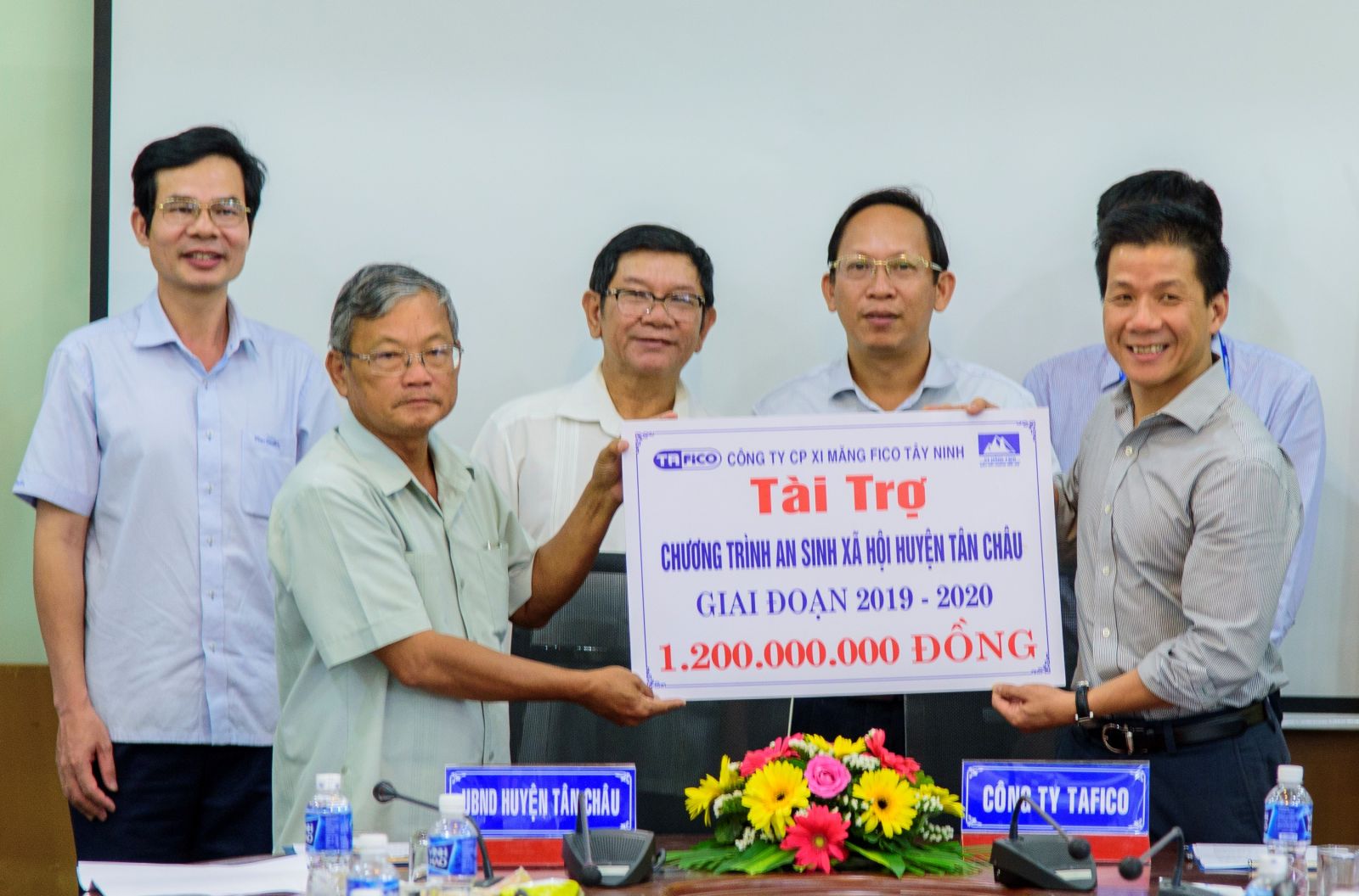 Công ty cổ phần xi măng Fico trao biển tượng trưng số tiền hỗ trợ chương trình an sinh xã hội cho huyện Tân Châu giai đoạn 2019-2020.