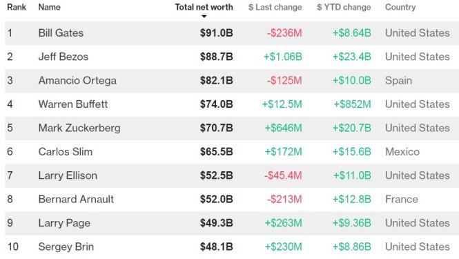 Dẫn đầu danh sách người giàu nhất thế giới, vào thời điểm ngày 25-7, vẫn là tỉ phú người Mỹ Bill Gates.