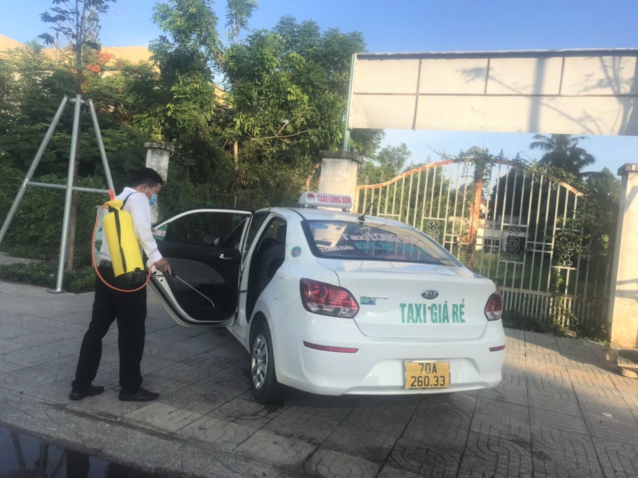 Tài xế taxi Long Sơn thực hiện khử khuẩn trên xe.