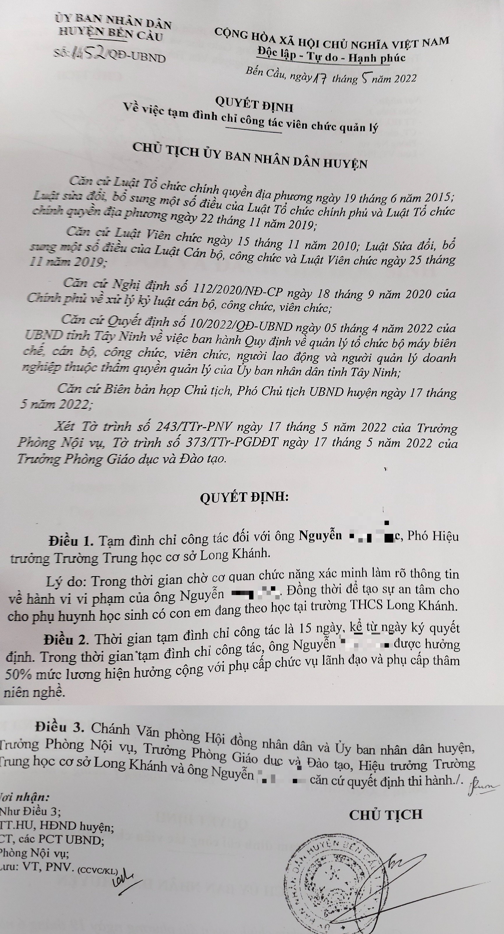 Chủ tịch UBND huyện Bến Cầu Phan Văn Hoà vừa ký quyết định tạm đình chỉ công tác đối với Phó hiệu trưởng bị tố sàm sỡ nữ sinh lớp 9 Trường THCS Long Khánh (xã Long Khánh).