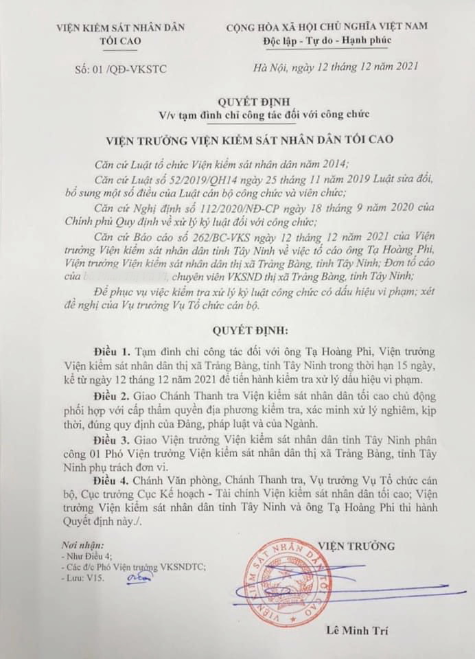 Theo Quyết định số 01 ngày 12.12.2021, Viện Kiểm sát nhân dân tối cao tạm đình chỉ công tác đối với ông Tạ Hoàng Phi- Viện trưởng VKSND thị xã Trảng Bàng trong thời hạn 15 ngày, kể từ ngày 12.12.2021 để tiến hành kiểm tra xử lý dấu hiệu vi phạm.