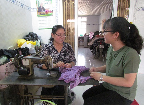 Chị Liên (bên trái) trao đổi với cán bộ Hội Phụ nữ xã Phước Đông.