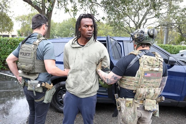 Ngày 22/1/2025, cảnh sát, nhân viên Cơ quan Thực thi Di trú và Hải quan Mỹ bắt giữ Franz Cadet (giữa), một công dân Haiti, 43 tuổi. Cadet đã bị kết án về nhiều tội liên quan đến ma túy. Ảnh: ICE.