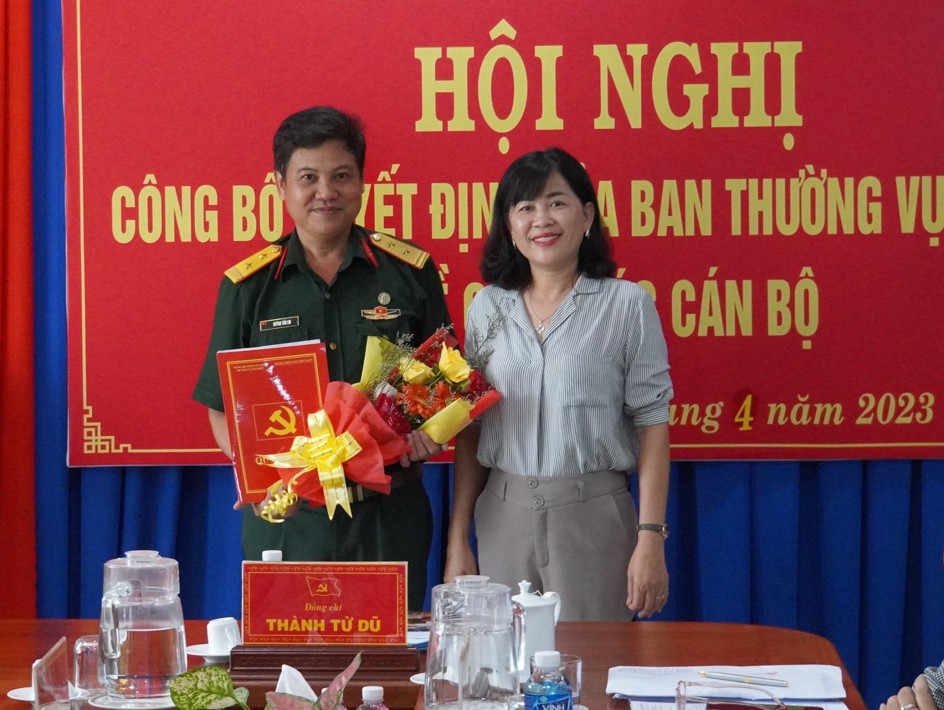 Bà Nguyễn Đài Thy trao quyết định của Ban Thường vụ Tỉnh uỷ chỉ định bổ sung Trung tá Huỳnh Tấn Em- Chỉ huy trưởng Ban Chỉ huy Quân sự huyện vào Ban Chấp hành, Ban Thường vụ Huyện uỷ Tân Biên nhiệm kỳ 2020-2025.