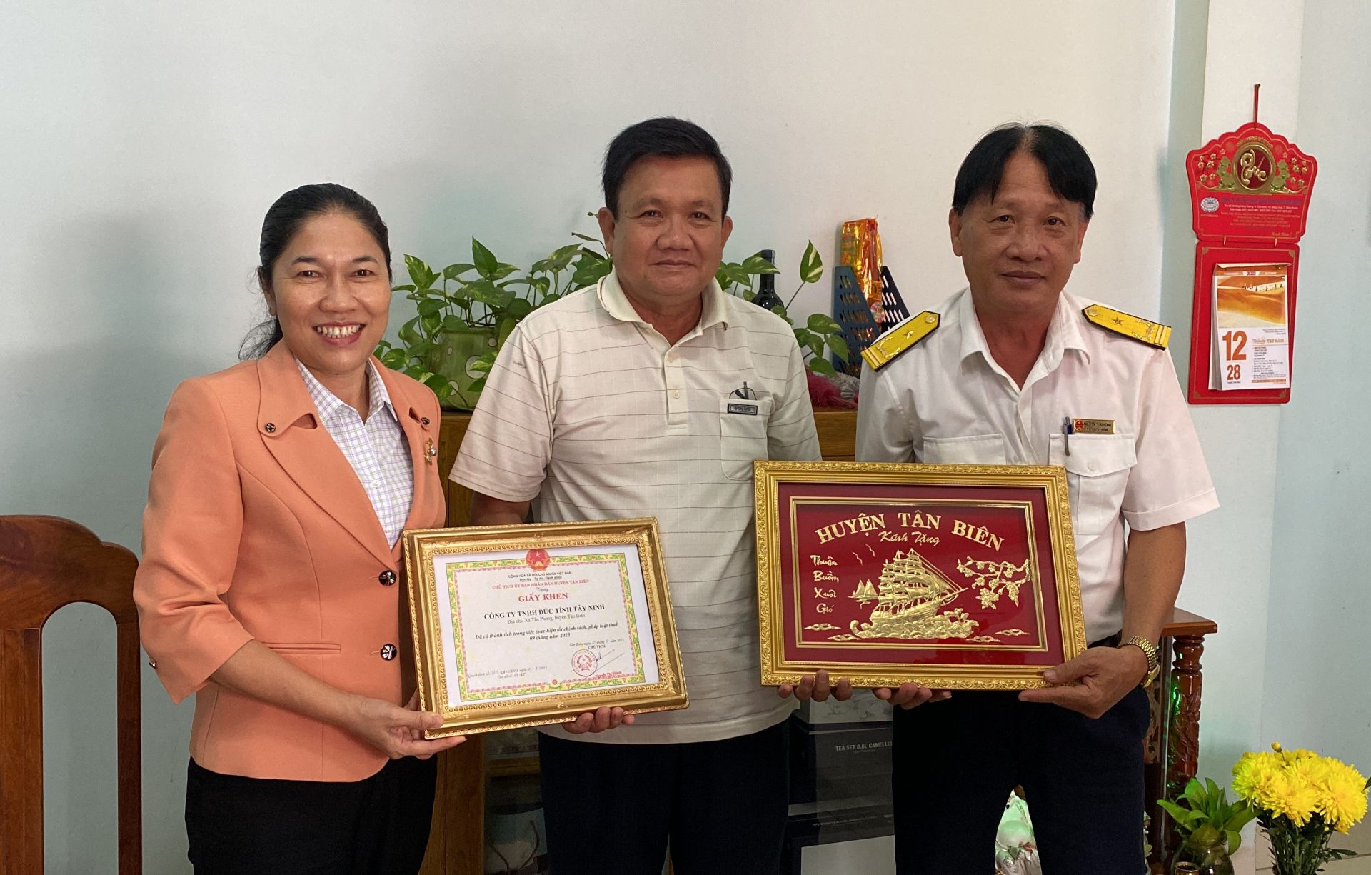 Chủ tịch UBND huyện Nguyễn Thị Thành (bên trái) và lãnh đạo Chi cục thuế khu vực Tân Châu – Tân Biên trao giấy khen, quà cho lãnh đạo Công Ty TNHH Đức Tính Tây Ninh.