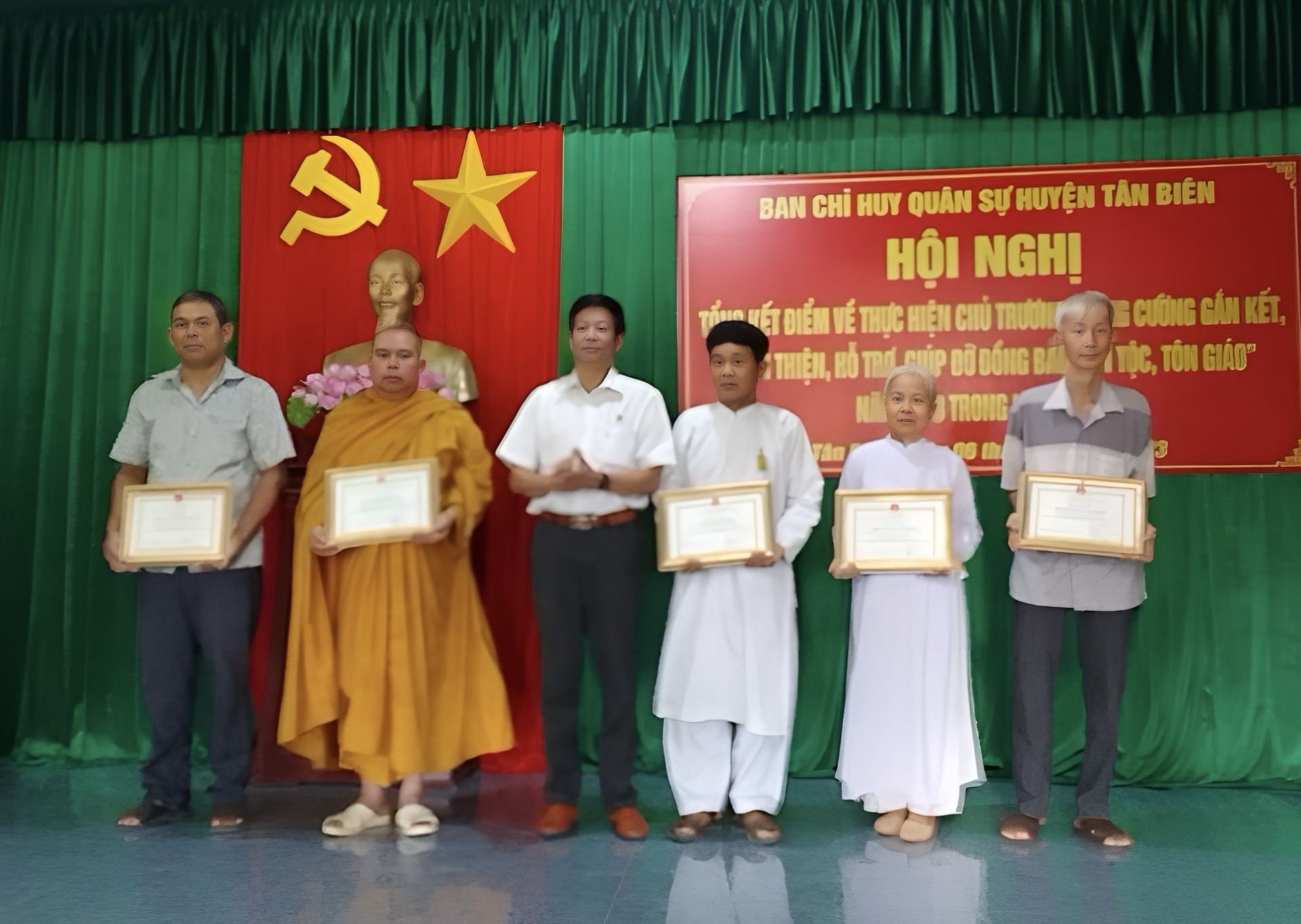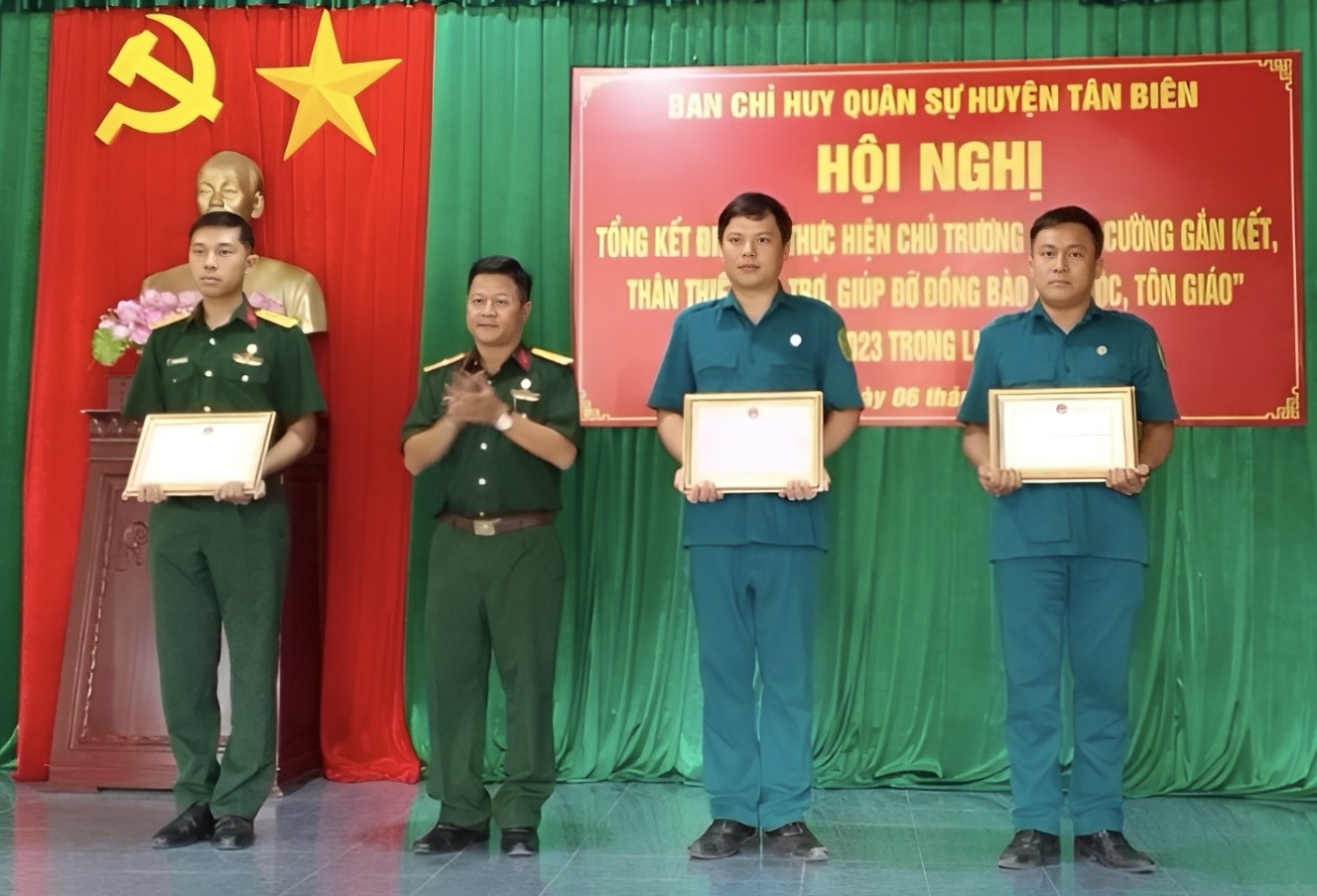 Chiều 6.11, Ban CHQS huyện Tân Biên tổ chức hội nghị tổng kết thực hiện điểm chủ trương “Tăng cường gắn kết thân thiện, hỗ trợ, giúp đỡ đồng bào dân tộc, tôn giáo” năm 2023 trong lực lượng vũ trang (LLVT) huyện.