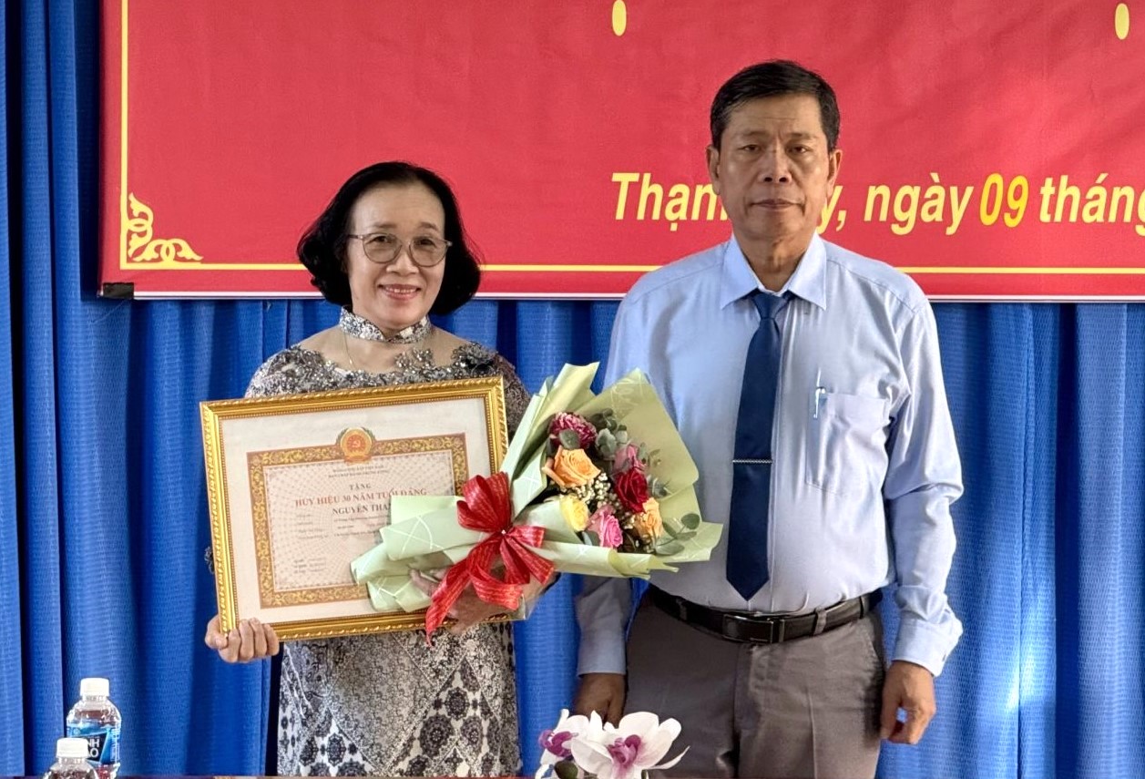 Tại buổi lễ, ông Nguyễn Ngọc Trỗi- Phó Chủ tịch UBND huyện trao Huy hiệu 30 năm tuổi Đảng cho đảng viên Nguyễn Thanh Thuỷ, sinh năm 1965 (quê quán xã Trung Lập Thượng, huyện Củ Chi, Thành phố Hồ Chí Minh), hiện sinh hoạt Đảng tại Chi bộ ấp Thạnh Sơn.