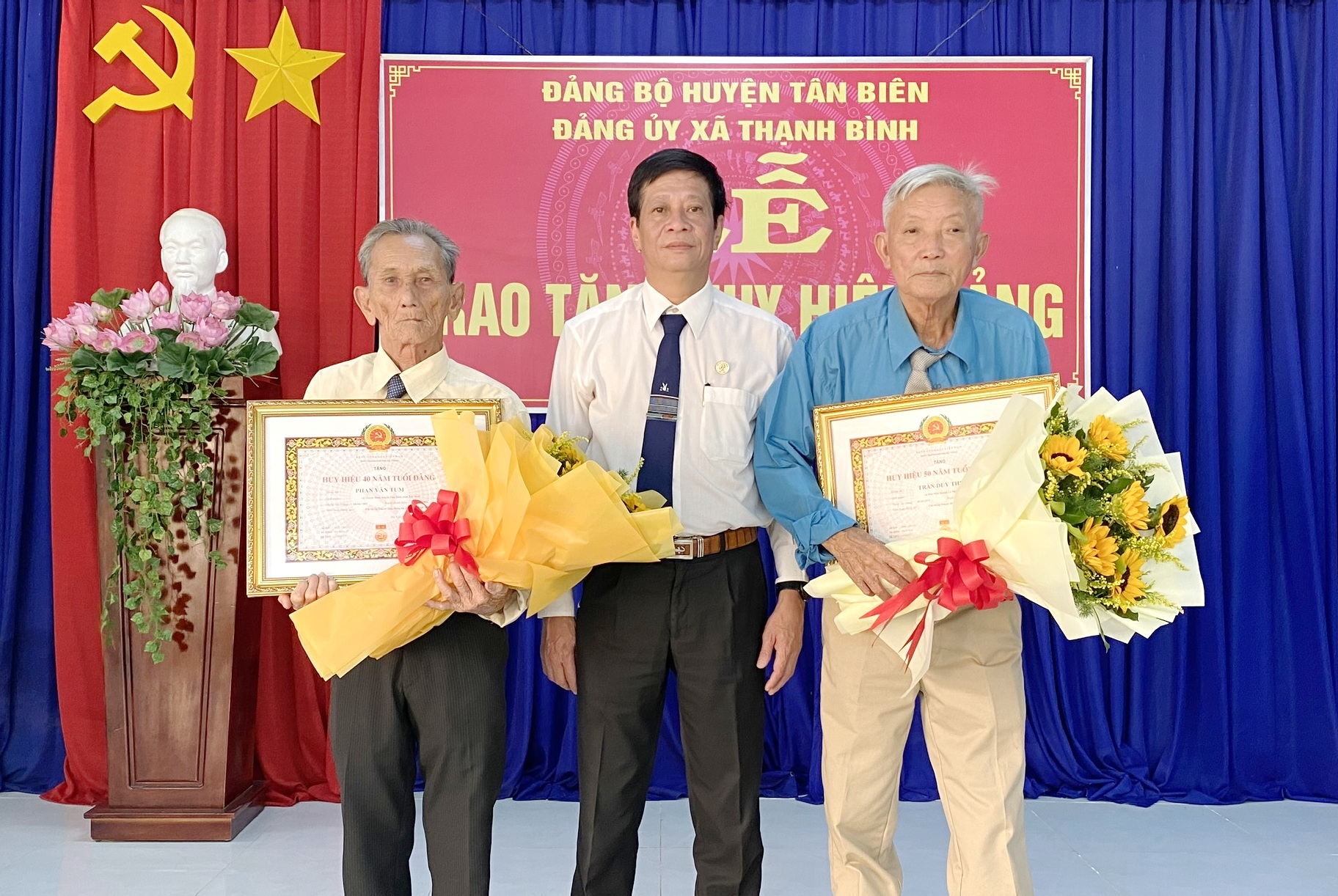 Ngày 20.6, ông Hồ Hùng Dũng- Trưởng Ban Dân vận Huyện uỷ Tân Biên đến dự và trao Huy hiệu 50, 40 tuổi Đảng cho 2 đảng viên thuộc Đảng bộ xã Thạnh Bình.