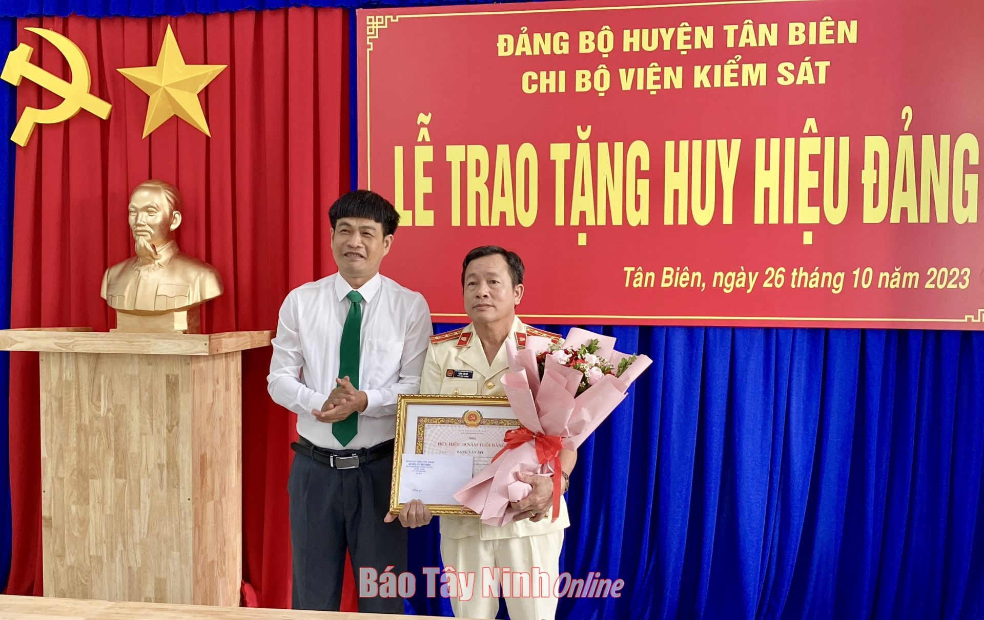Mới đây, tại Chi bộ Viện Kiểm sát nhân dân huyện Tân Biên, ông Thành Từ Dũ- Bí thư Huyện ủy, Chủ tịch HĐND huyện đến dự và trao Huy hiệu 30 năm tuổi Đảng cho đảng viên Đặng Văn Mỳ- Phó Viện trưởng Viện Kiểm sát nhân dân huyện Tân Biên.