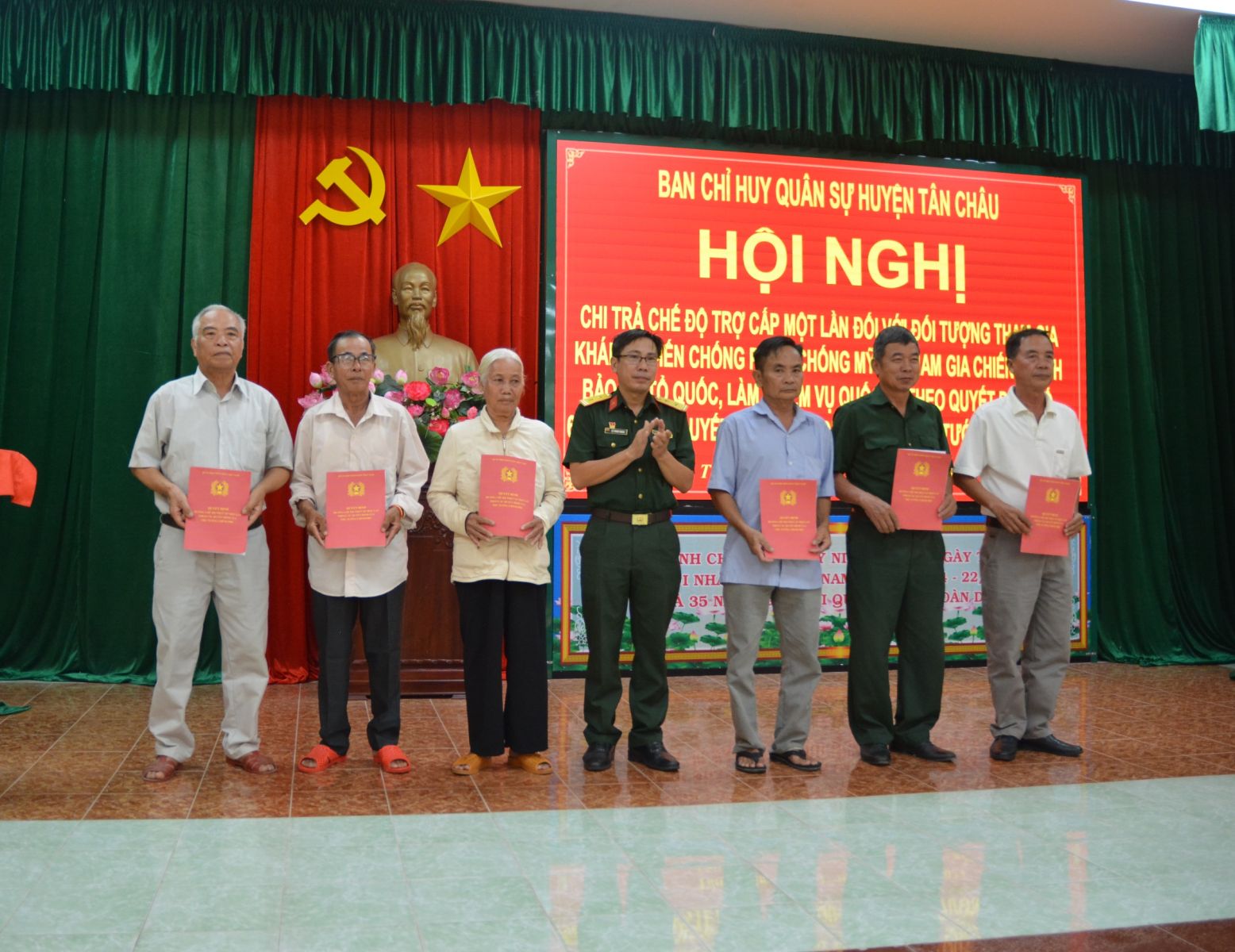 Chiều 27.12, Ban Chỉ huy Quân sự huyện Tân Châu tổ chức hội nghị chi trả chế độ, trợ cấp một lần cho các đối tượng theo các Quyết định số 62 và 49 của Thủ tướng Chính phủ về thực hiện chế độ chính sách đối với đối tượng trực tiếp tham gia kháng chiến chống Pháp, chống Mỹ và tham gia chiến tranh bảo vệ Tổ quốc, làm nhiệm vụ quốc tế ở Lào, Campuchia đã phục viên xuất ngũ, thôi việc đang thường trú trên địa bàn huyện.