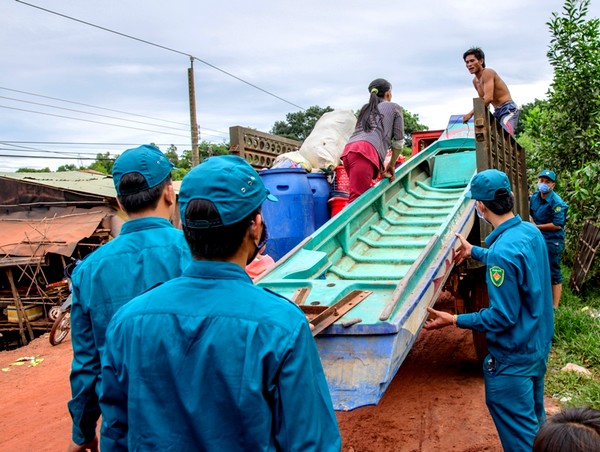 Lực lượng dân quân xã Tân Thành hỗ trợ bà con di dời.