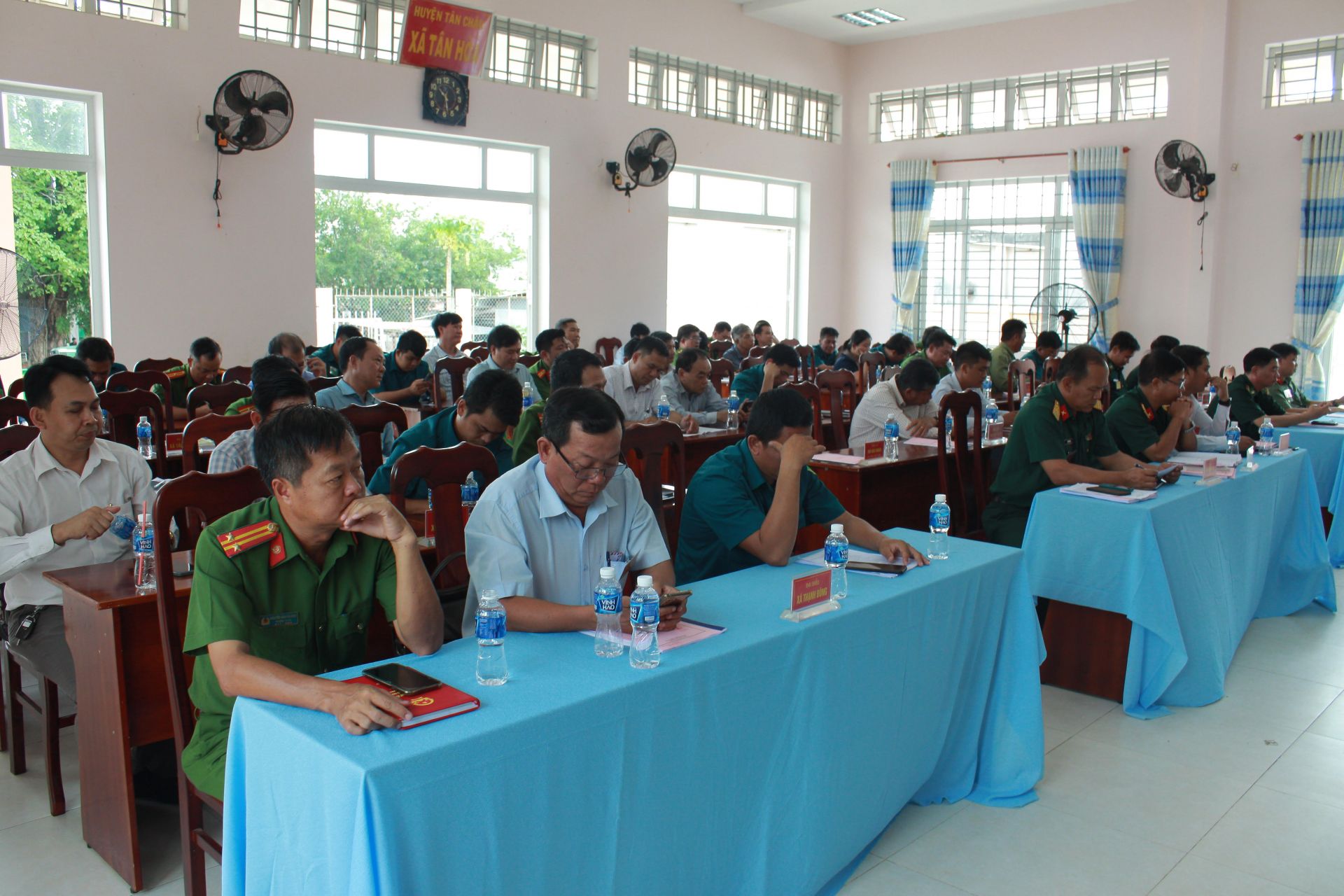 Diễn tập chiến đấu phòng thủ xã Tân Hoà năm 2023 được tổ chức thành 3 giai đoạn với 8 vấn đề huấn luyện gồm: giai đoạn 1 chuyển lực lượng vũ trang vào các trạng thái sẵn sàng chiến đấu, chuyển hoạt động của địa phương vào các trạng thái, tình trạng quốc phòng; giai đoạn 2 tổ chức chuẩn bị chiến đấu A3 cường độ thấp và giai đoạn 3, thực hành chiến đấu A3 cường độ thấp.