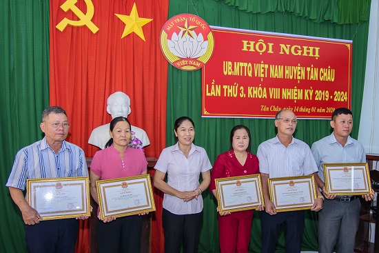 Nhân dịp này, UBND tỉnh, UBMTTQ Việt Nam tỉnh và UBND huyện Tân Châu đã tặng bằng khen và giấy khen cho nhiều tập thể và cá nhân đã có thành tích xuất sắc trong công tác mặt trận 2019.