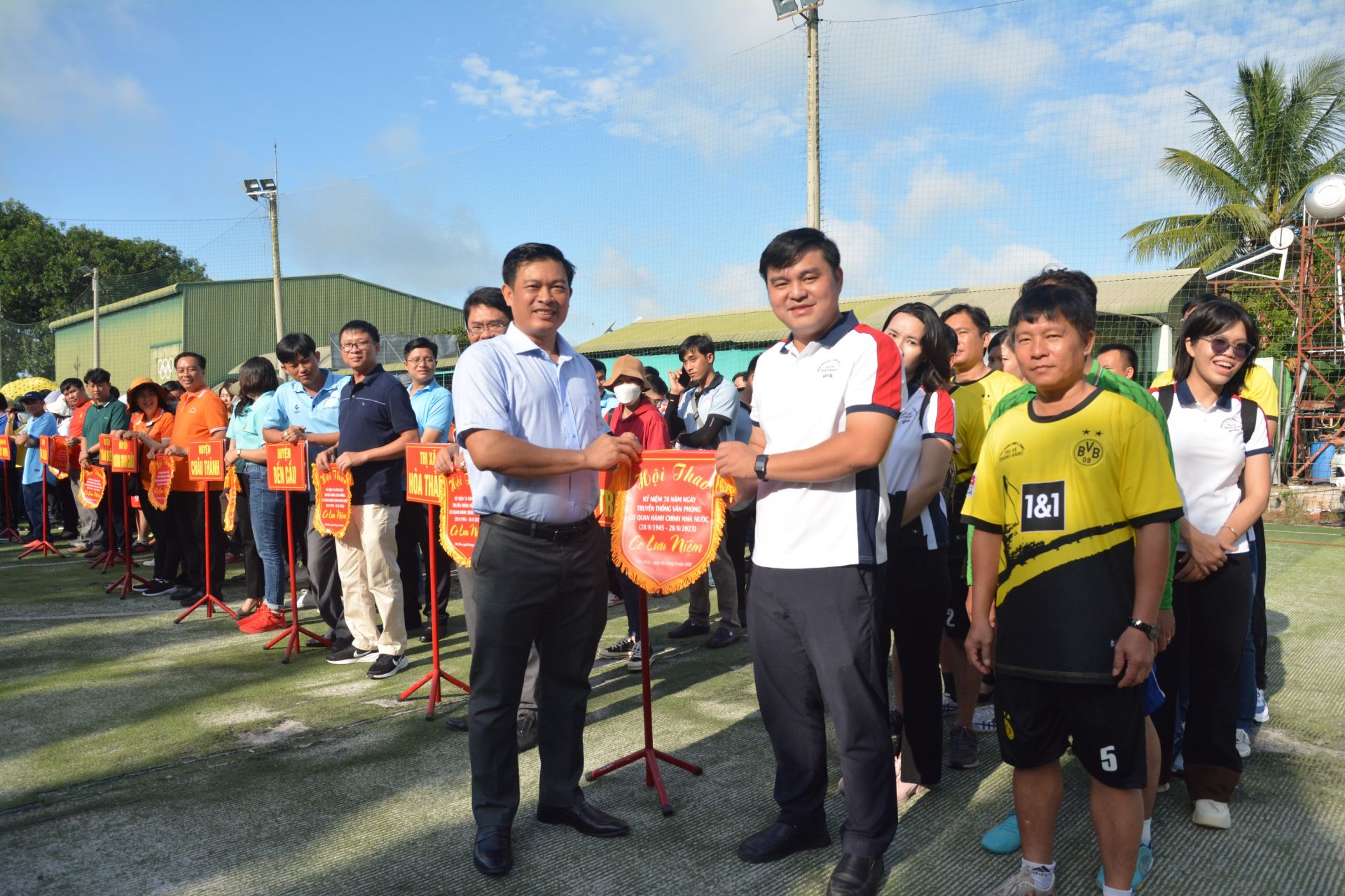 Ông Võ Hồng Sang- Chủ tịch UBND huyện Tân Châu trao cờ lưu niệm cho các đội.