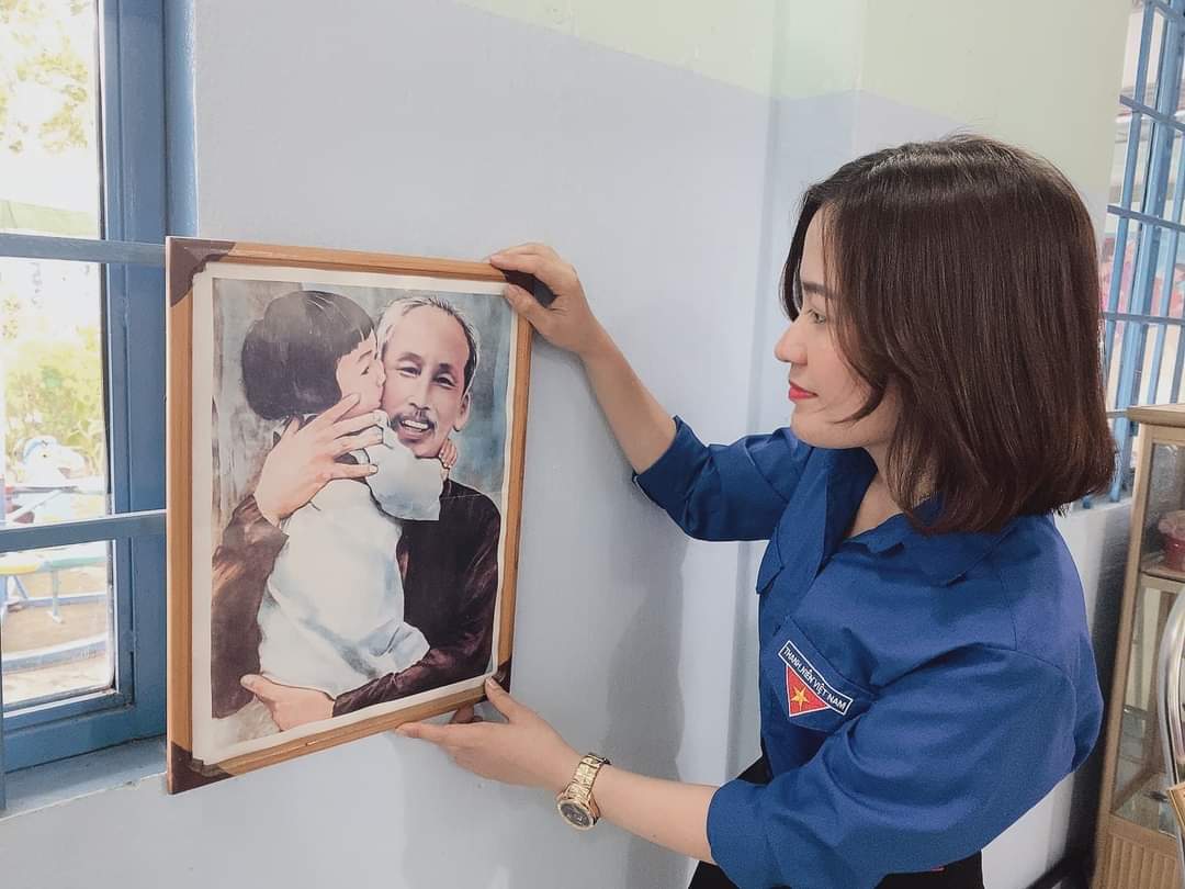 Cô giáo Trần Thị Mỹ Hạnh, đoàn viên chi đoàn Trường Mầm non Nước Trong với bức ảnh “Bác Hồ với thiếu nhi”.
