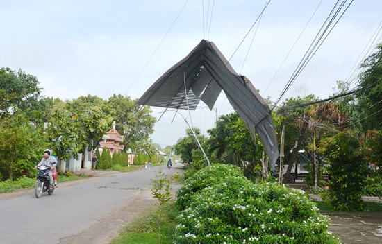 Gió lốc thổi cả mái tôn bay vướng vào dây điện.
