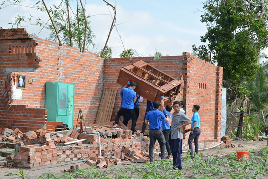 Đoàn viên, thanh niên huyện Tân Châu giúp người dân thu dọn, khắc phục hậu quả của thiên tai.