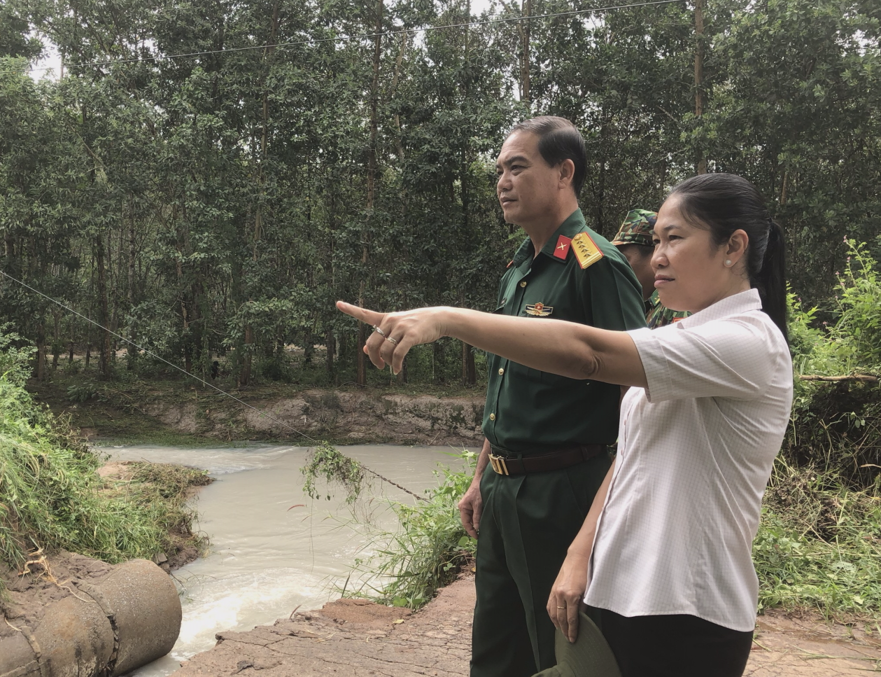 Bà Nguyễn Thị Thành- Chủ tịch UBND huyện Tân Châu và Đại tá Ngô Thành Đồng- Chỉ huy trưởng Bộ CHQS tỉnh kiểm tra hiện trường sạt lở, lên phương án khắc phục.