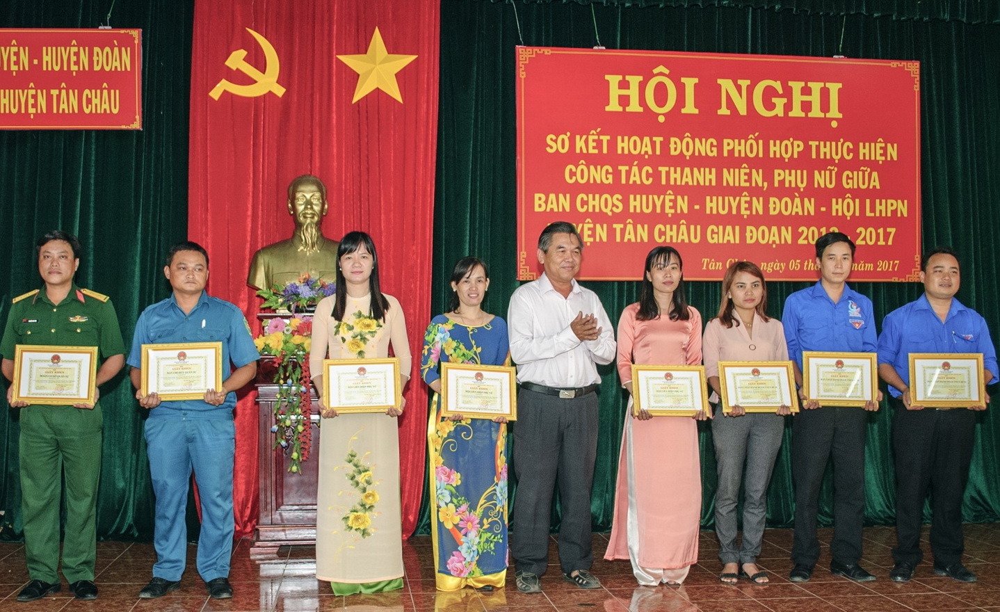 UBND huyện Tân Châu khen thưởng cho các tập thể có thành tích trong thực hiện chương trình phối hợp công tác thanh niên, phụ nữ. |